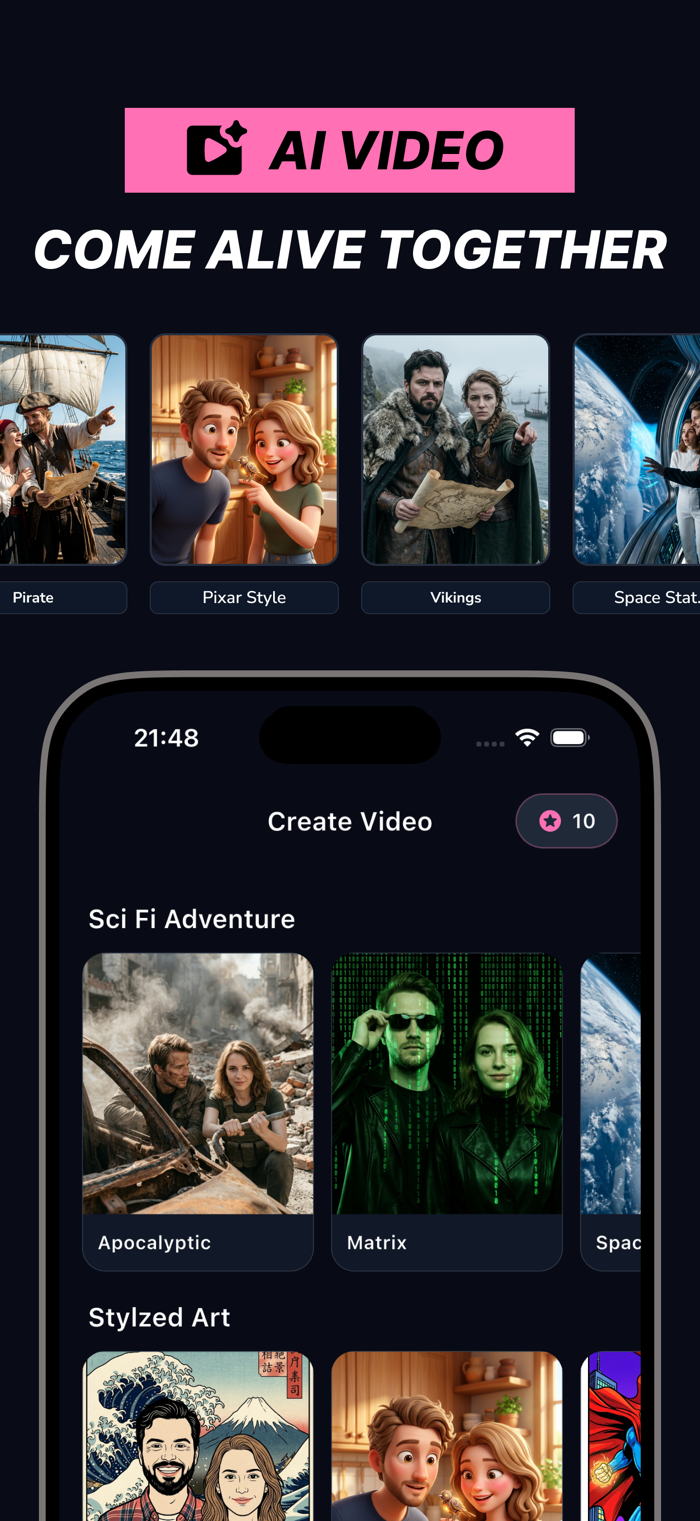 不仅是照片,更多AI生成的情侣视频模板等你体验。模板包含赛博朋克、矩阵、海盗、皮克斯3D、复古街机等,定期新增风格。