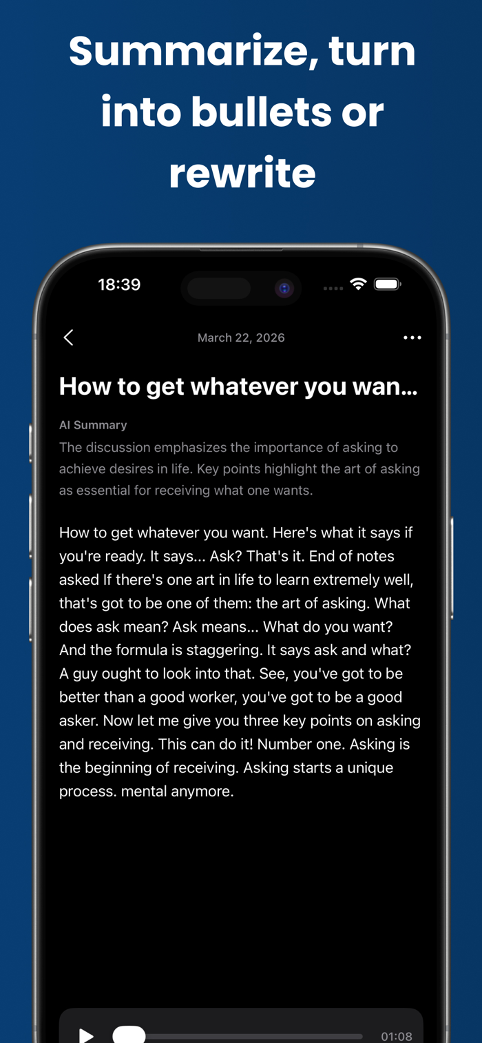 Long recording? Get an instant summary - key points, action items, and highlights extracted automatically. Turn a 30-minute meeting into a 30-second read.