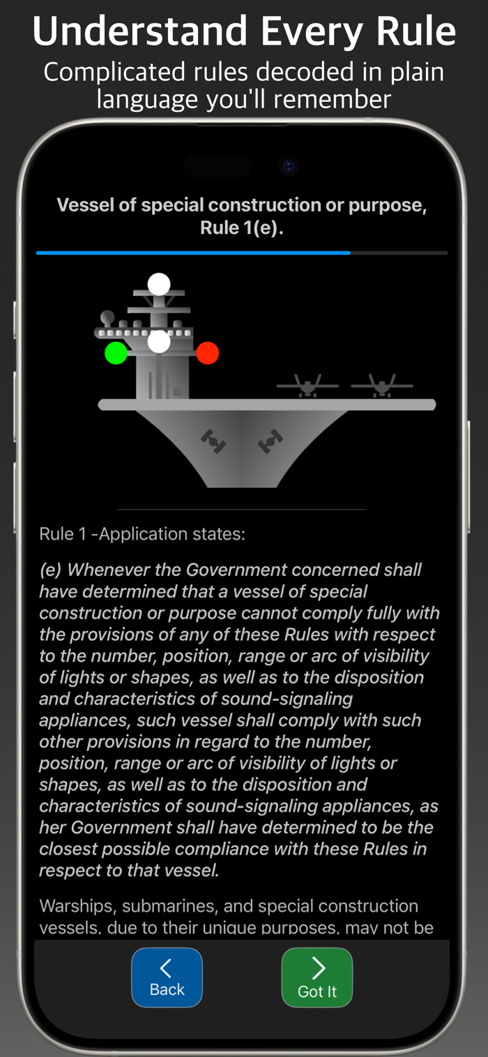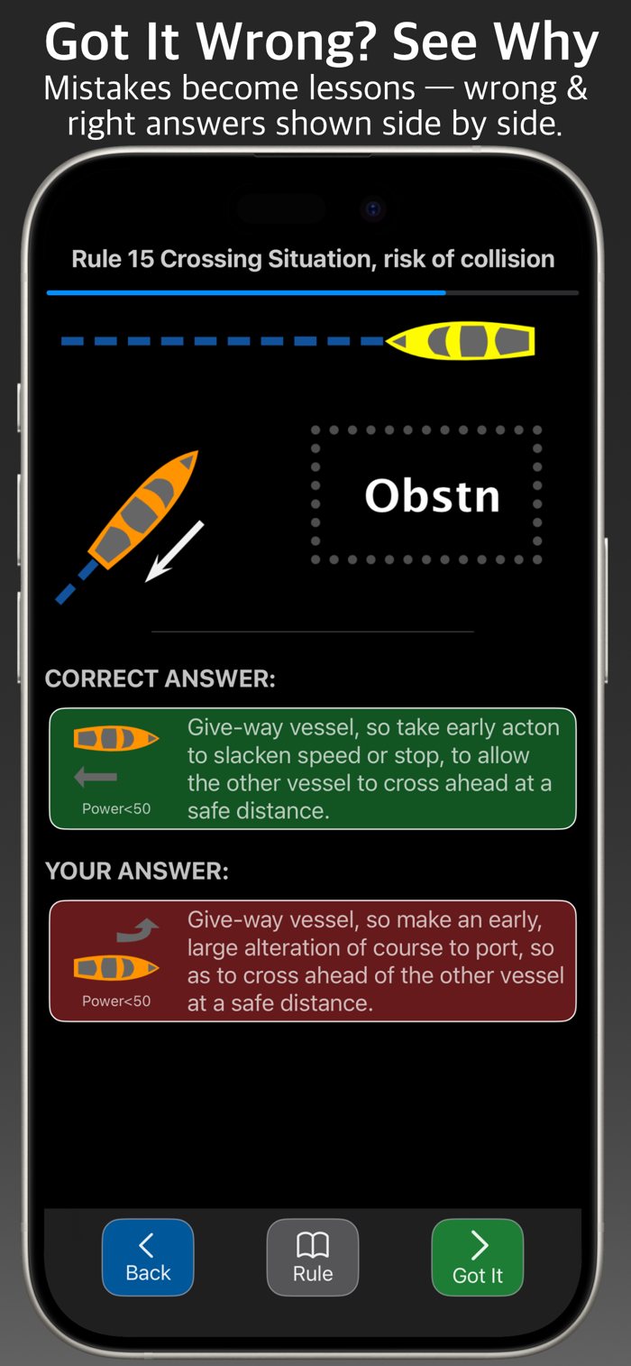Every incorrect answer is shown graphically alongside the correct one — immediately clear, no confusion. And with a single tap, the relevant COLREGS rule is accessible from any question at any time.