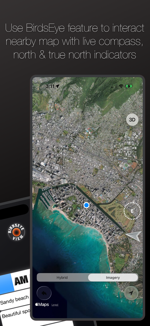 The Birdseye View button provides an overhead look of the current location, and like any Maps view, can panned around and zoomed in or out.
