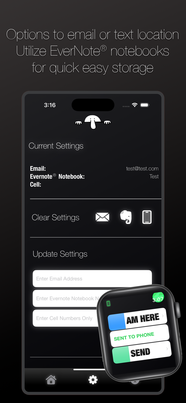 The Settings page includes detail about the user's currently defined and saved data, mainly the email address or cell used to send messages, plus an option to include an Evernote Notebook name. If an Evernote Notebook is included, and a properly configured Evernote email address is saved, the notes will populate in the appropriate notebook on Evernote's platform. To do this, the email message subject is appended appropriately with the proper suffix and notebook name. If not included, the email subject will either be the user defined field from the main page, or blank.