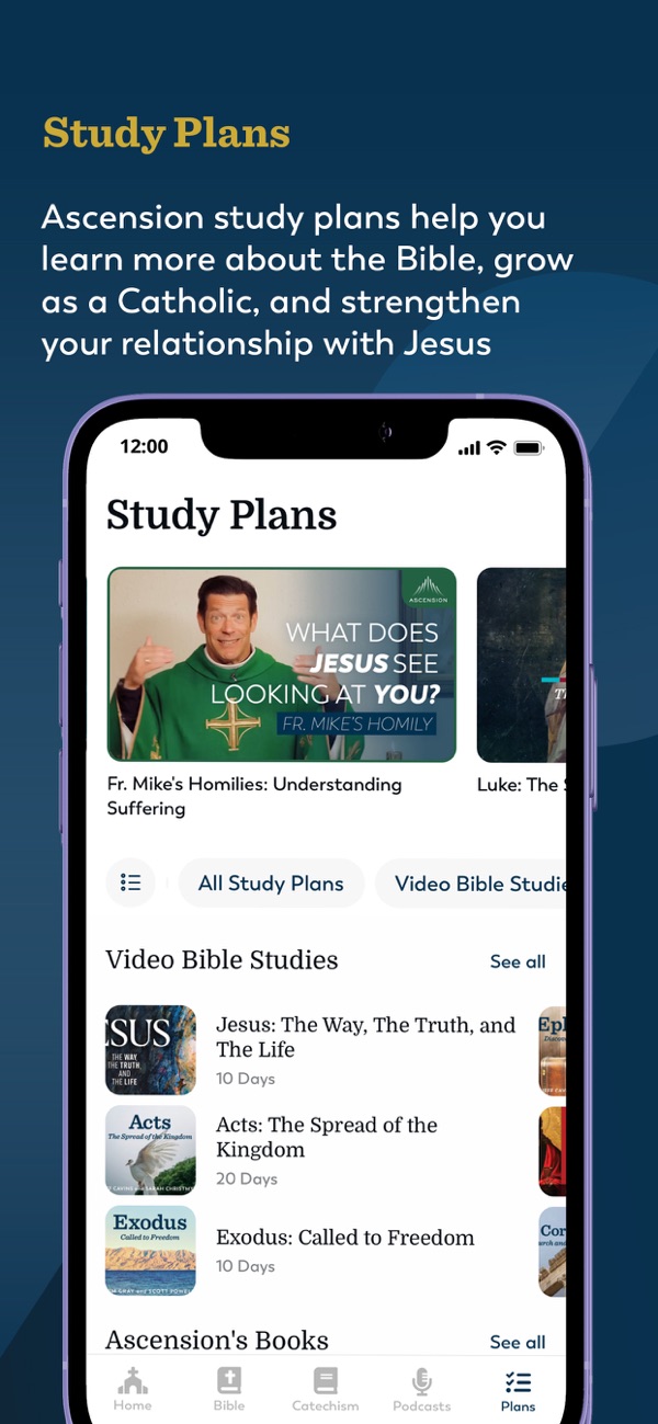 Browse from 80+ study plans taught by leading Catholic presenters, including Fr. Mike Schmitz, Jeff Cavins, Dr. Edward Sri, Sarah Christmeyer, Jackie Francois Angel, and many others. Study plans are a companion to help you understand the Bible better, learn more about Catholic teaching, and strengthen you to more fully live the life God is calling you to.