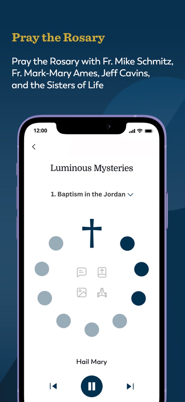 Fr. Mike Schmitz, Fr. Mark-Mary Ames, Jeff Cavins, the Sisters of Life, and Paul Rose lead recordings of the Joyful, Luminous, Sorrowful, and Glorious mysteries of the Rosary. Pray in English or Latin, with options to chant the prayers.