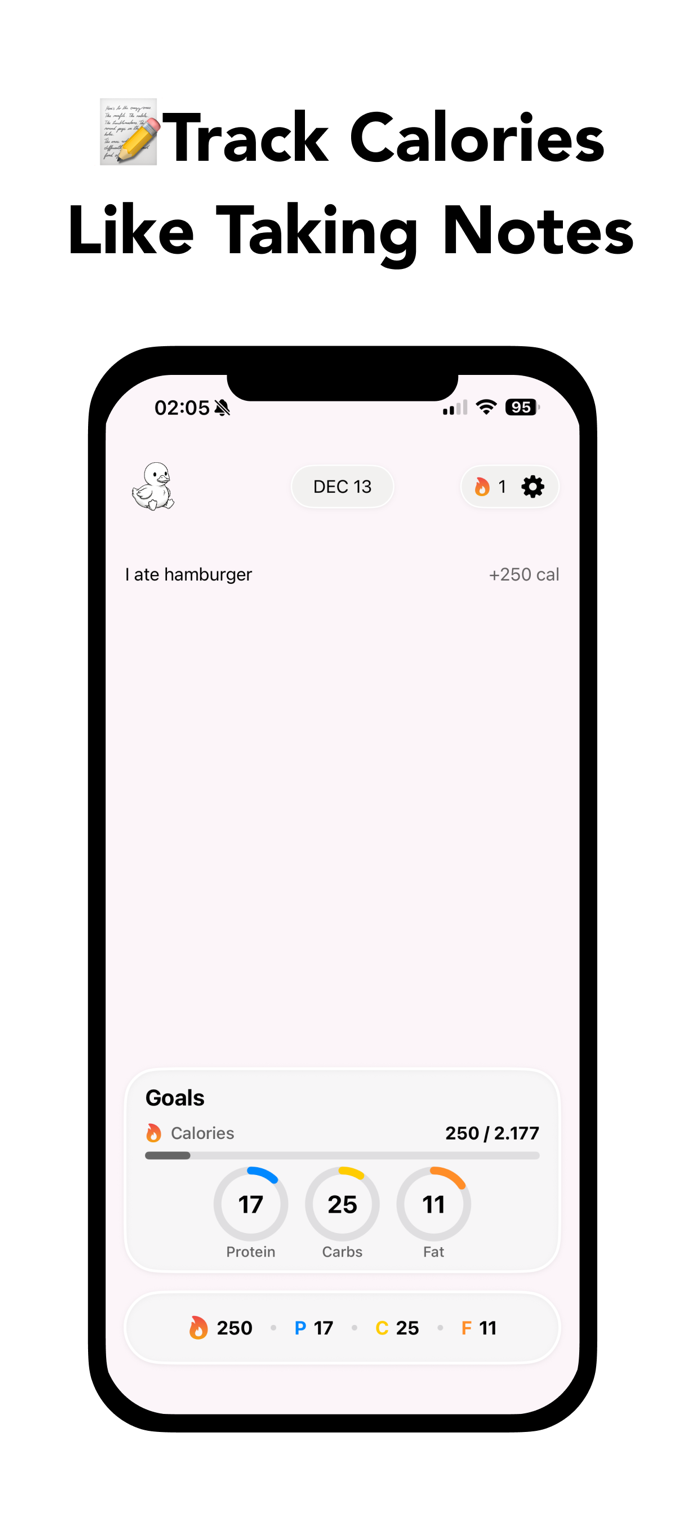 CalNote是最简单的卡路里追踪器,像Apple Notes一样便捷。无需条形码扫描、食物数据库,无复杂操作。打开应用输入所吃食物,3秒即得即时营养信息。告别在其他应用中搜索无尽食物列表、扫描条形码、从多种鸡肉变体中挑选、用杯子和秤测量、导航复杂菜单等繁琐操作,无学习曲线,会用Notes就能用它追踪饮食,如输入2片披萨可快速获取热量、蛋白质、碳水化合物、脂肪等营养数据。