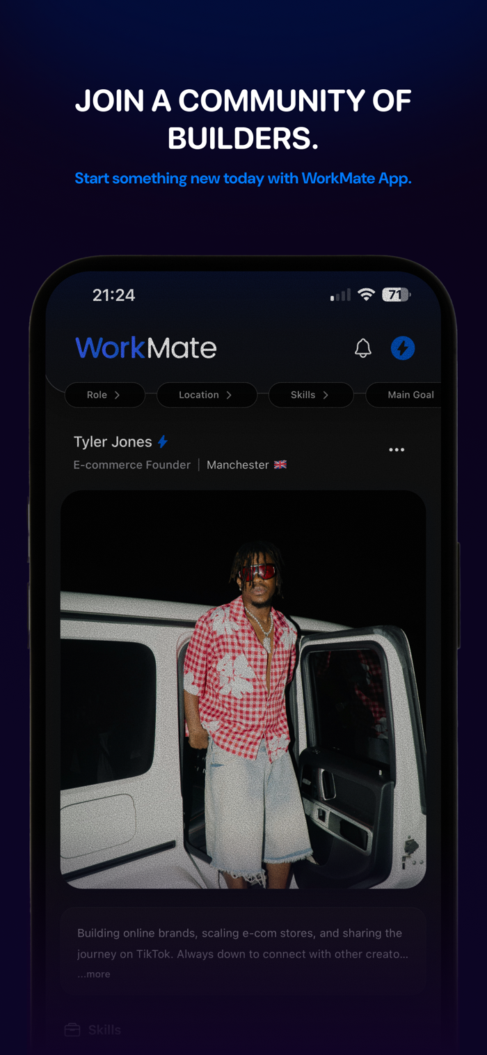 Stop going it alone. Download WorkMate today and start building with the perfect teammate. Your next big project starts with one swip...