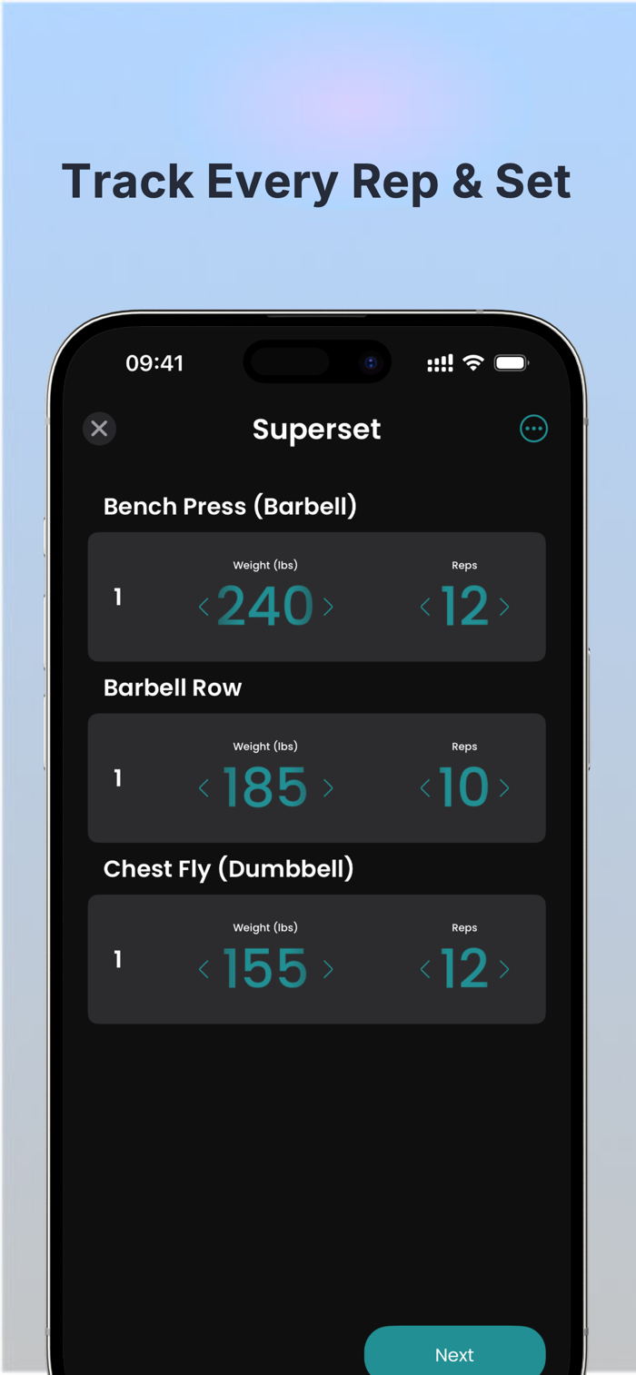 • Workouts — Keep a complete log of every exercise with weights, reps, and progress. Build custom training programs, create supersets, and track your performance on every lift