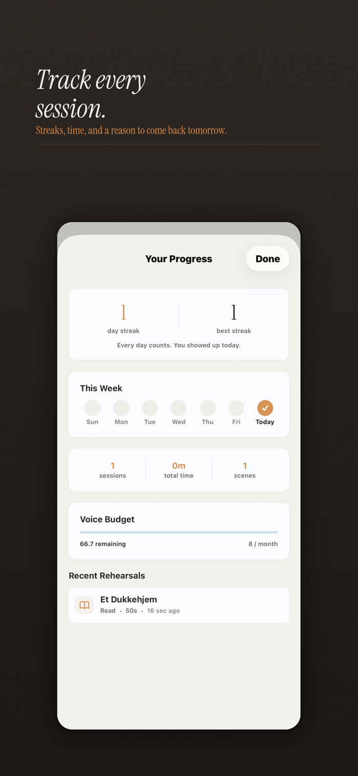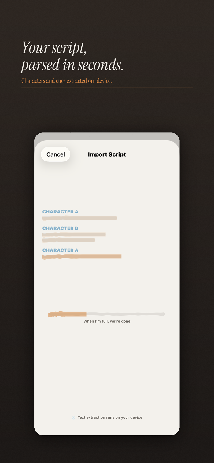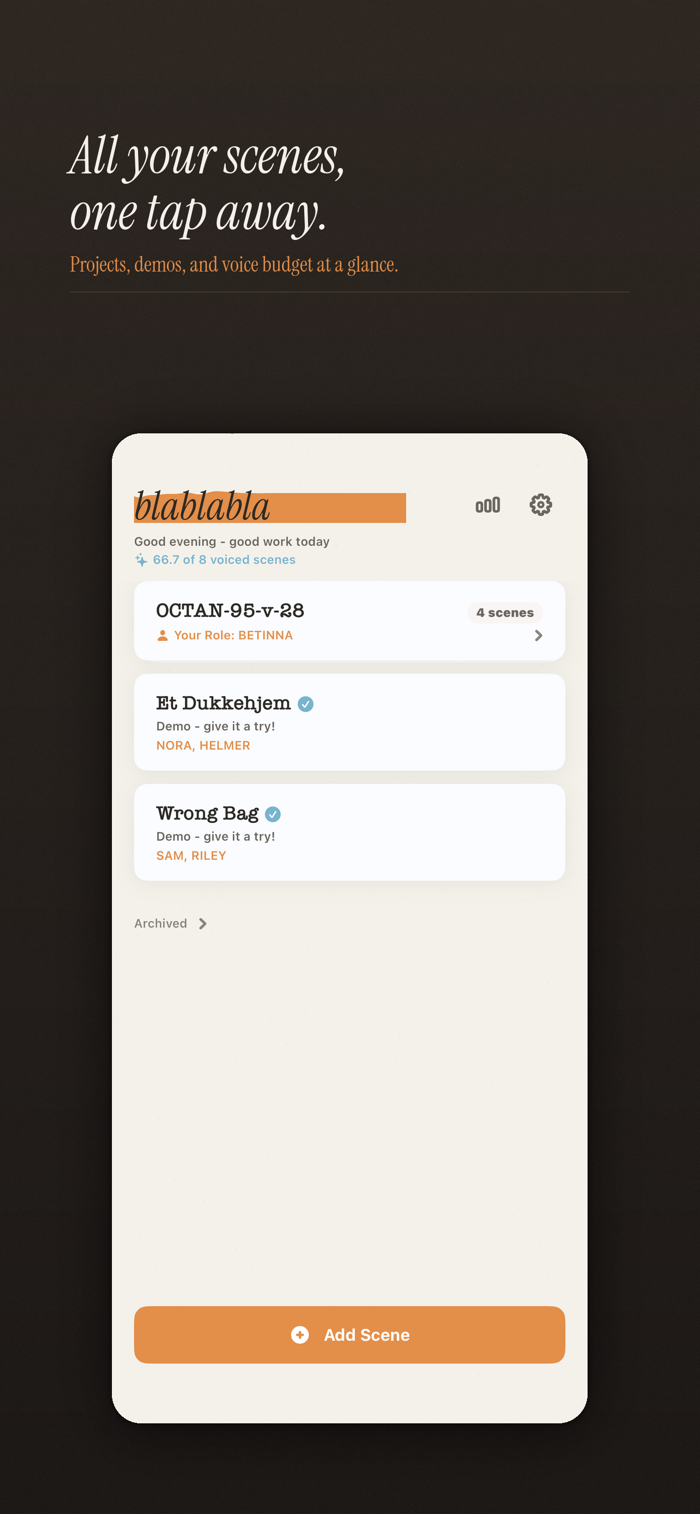 blablabla is a rehearsal partner that lives on your phone. Drop in a scene, tell it which part is yours, and it reads everyone else's lines out loud while you practice yours. A patient scene partner who's always available, never judges, and never talks over you.