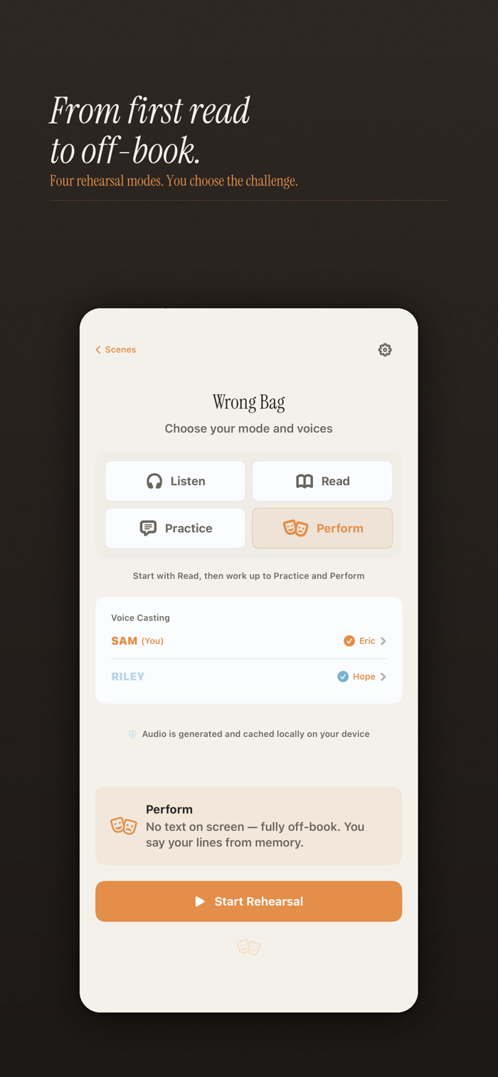 Once audio is cached, everything runs offline. Rehearse on the subway, backstage, wherever.