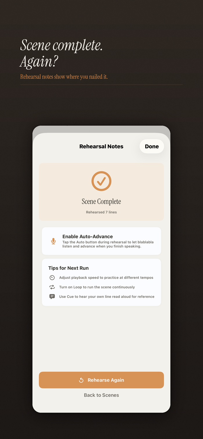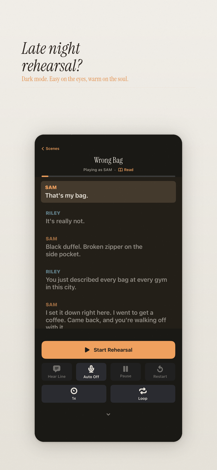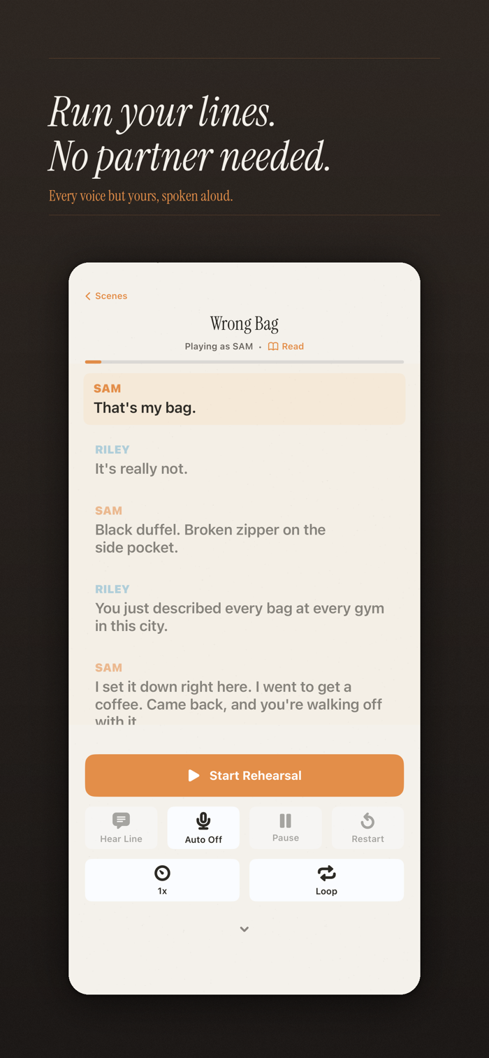 3. Hit rehearse. blablabla speaks the other characters' lines using AI voices, then waits for you. It won't cut you off. When you're ready, tap to continue or let the app listen and advance on its own.