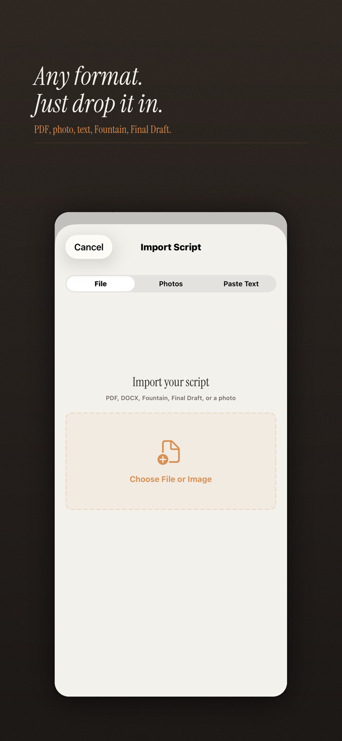 1. Bring your script. Paste text, import a PDF, snap a photo of your pages, or upload a Fountain or Final Draft file. blablabla figures out the dialogue automatically.