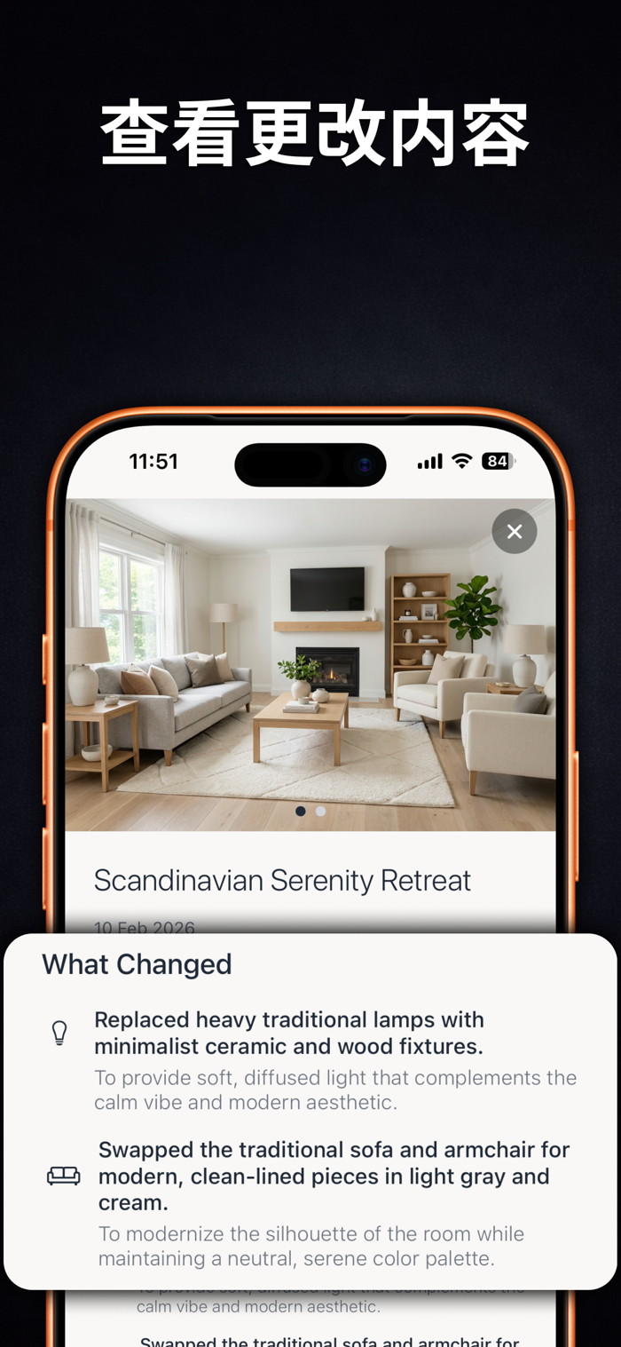 看得见,也听得懂。AI 不只给你一个新房间效果,还会从灯光、动线到家具摆放,逐点解释设计逻辑,帮你系统提升空间品味。