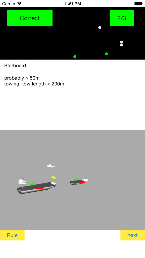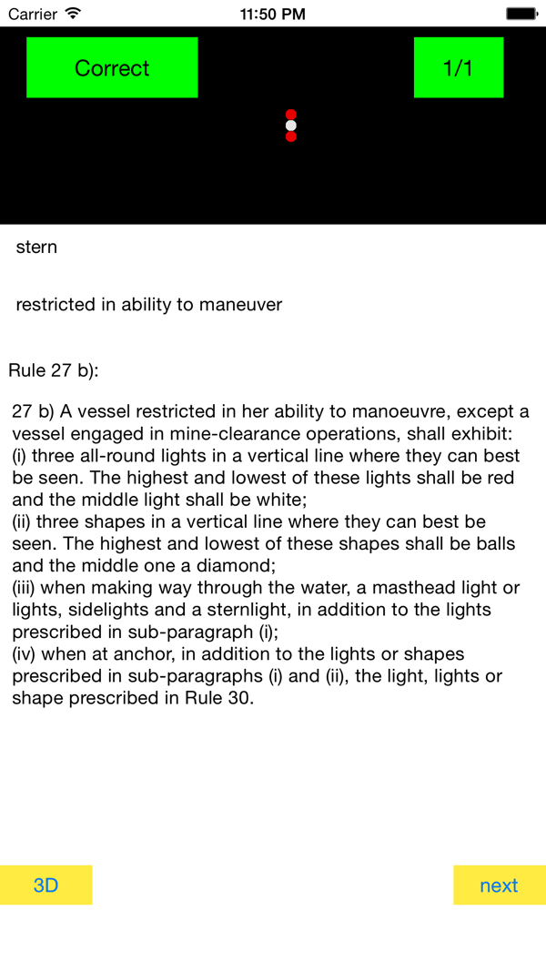 通过自我测试学习《国际海上避碰规则》(COLREGS)中的灯光和形状(COLREGS partC)知识。包含COLREGS中的所有灯光布置和形状。问题涵盖了各种观点及组合。《答案》附带COLREGS中的文本和相关规则的编号。关于灯光的问题,采用透视图显示每种灯光的可见范围。为了减少应用程序的大小,所有配置均基于3D灯光模型生成。本应用是免费的,带有广告支持。