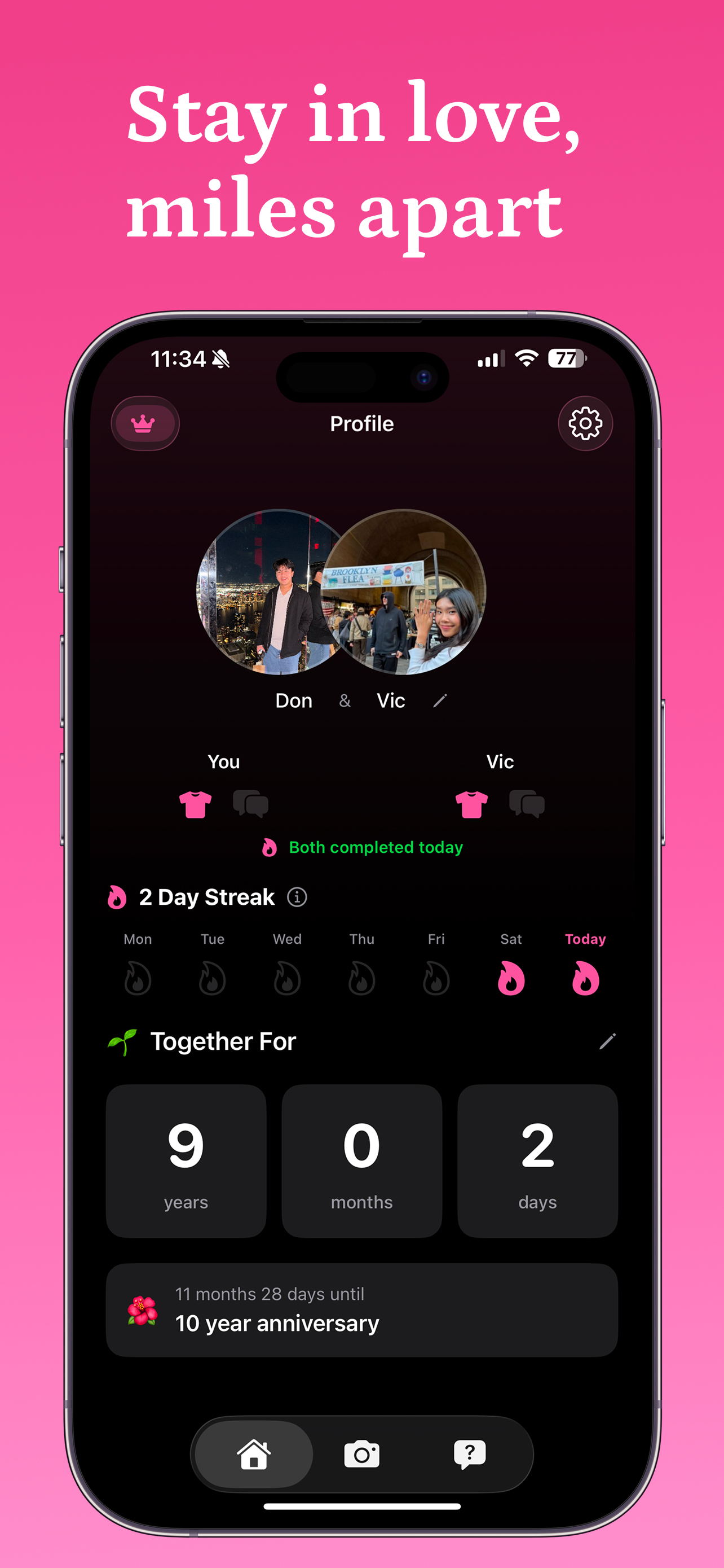 即使相隔两地,Vicinity也能帮助情侣保持亲密联系。通过主屏幕 widgets,能即时看到伴侣的最新照片。像BeReal一样分享穿搭照片,追踪距离,庆祝恋爱时长。通过每日情侣问题增进亲密感,玩游戏,实时分享答案,并在共享的照片日志中重温回忆。随着每日连胜天数的增加,共同成长,见证你们的感情蓬勃发展。
