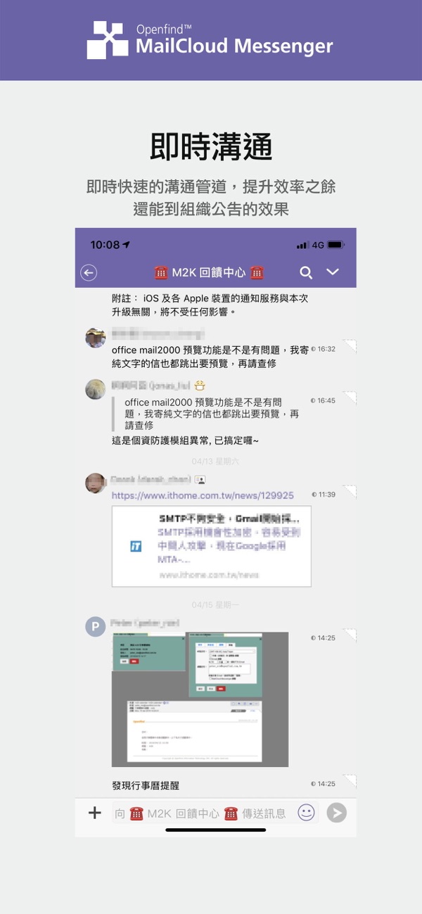MM 是 Openfind MailCloud 企业云端服务推出的新产品,结合文字、语音讯息传递、群组共同标签等功能,让组织沟通更即时高效。它能整合通讯录用语音、文字、音频传送,轻松建群并提供过滤功能找重要工作讯息,是企业等级符合资安需求的讯息平台,还能用文字 Tag 分类,趣味贴图与投票功能可增加团队合作效率。