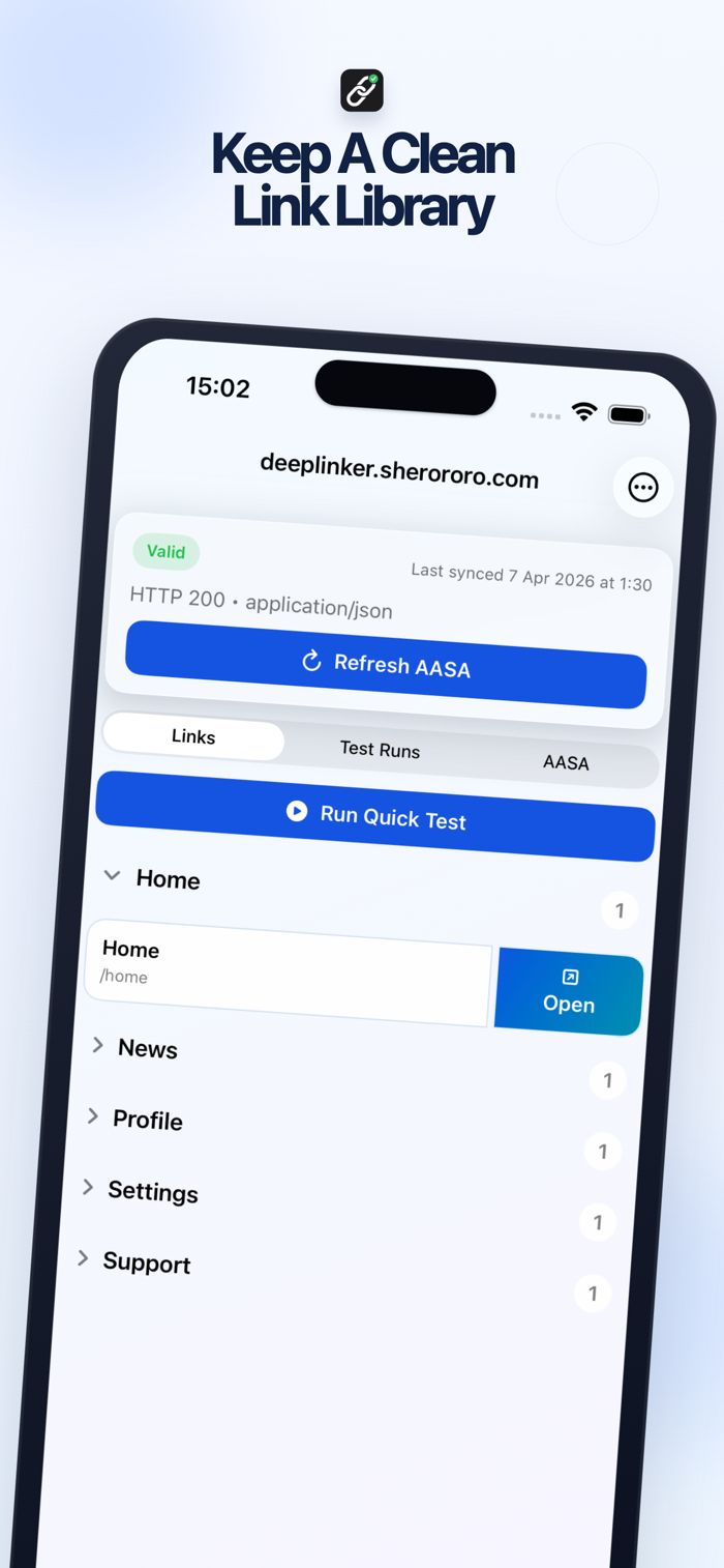 Use DeepLinker to validate AASA configuration, keep a clean link library, import links from pasted text, and run quick or full test sessions with simple pass or fail tracking.