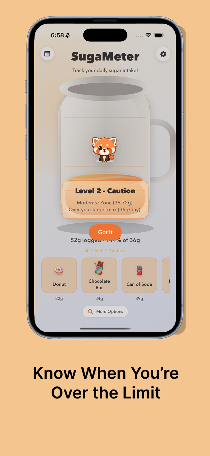 SugaMeter让你清晰简单地追踪每日糖分摄入。无需复杂操作、账户或分心因素,只需记录饮食,就能看到糖分克数累加,了解与每日目标的差距。专为正念追踪设计,数据本地存储于设备,关注意识而非评判。可记录常见食物饮料的明确含糖量,即时查看每日总量,无卡路里计数和营养过载。通过可视化仪表、简单级别及温和提示助你理解摄入情况,还能查看过往记录、每日总量和连续记录天数,通过主屏幕和锁屏小部件保持正念。