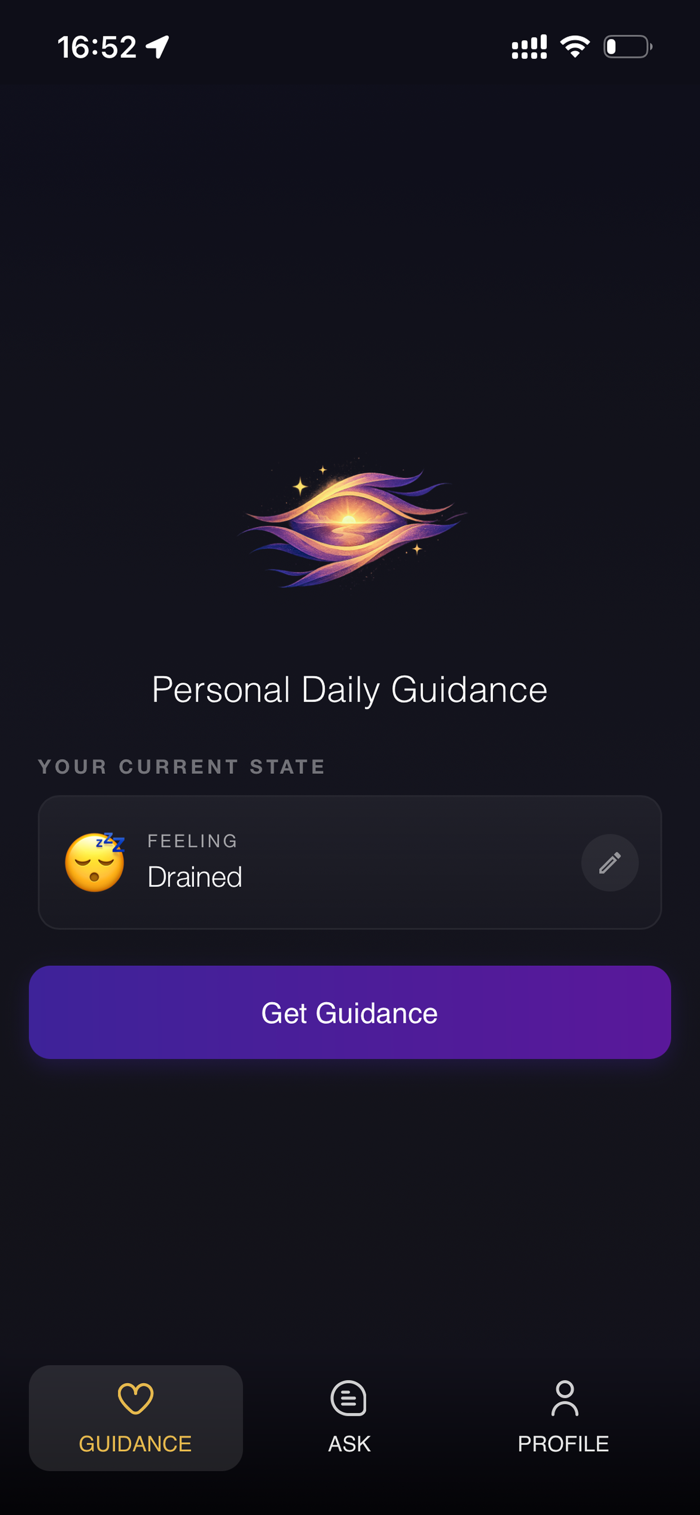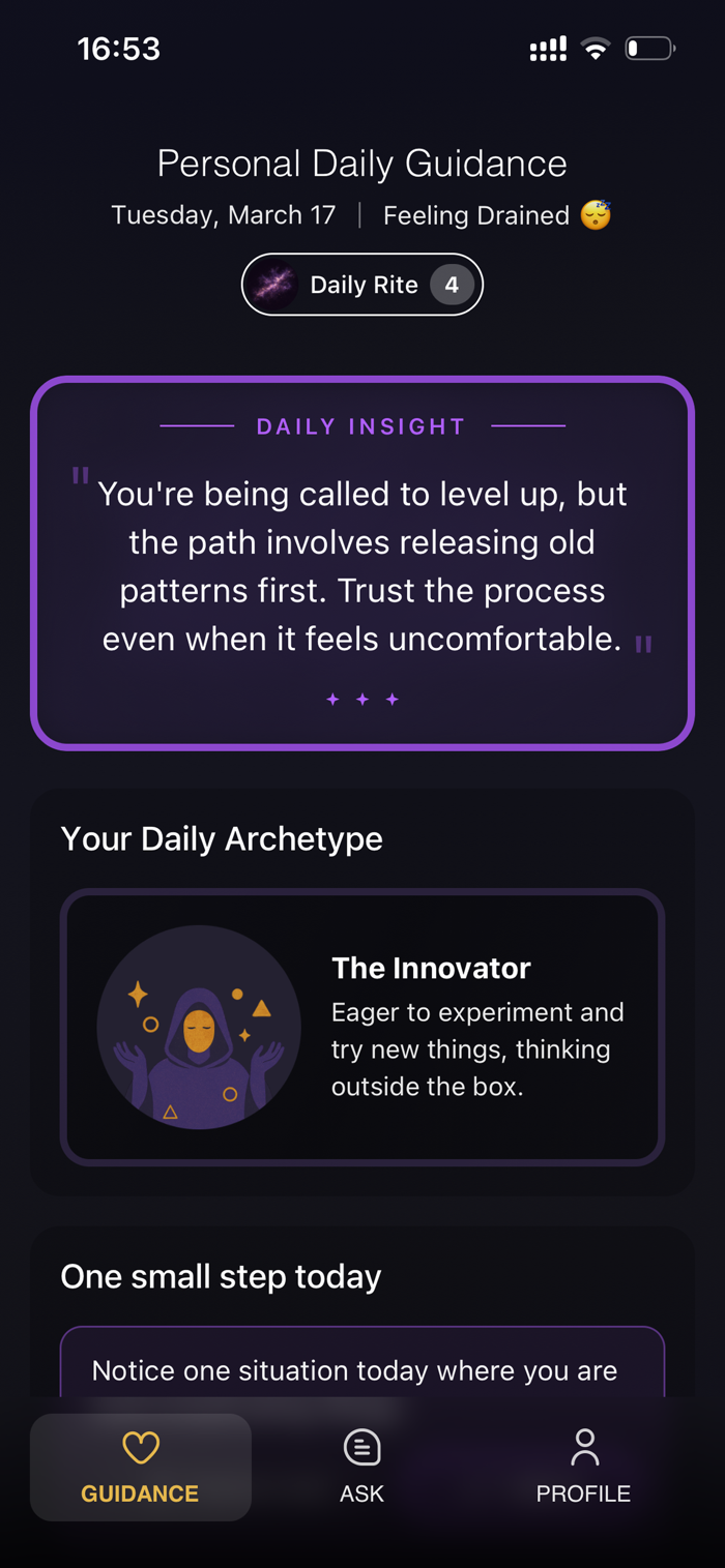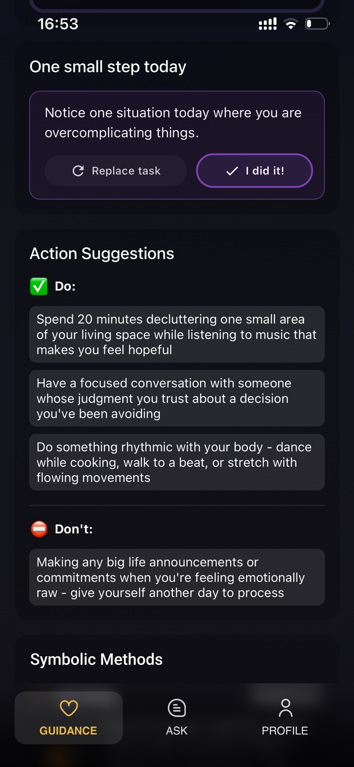 The app combines multiple reflective perspectives, including psychology, common sense, and optional symbolic lenses, to help users explore situations in a broader and more thoughtful way.