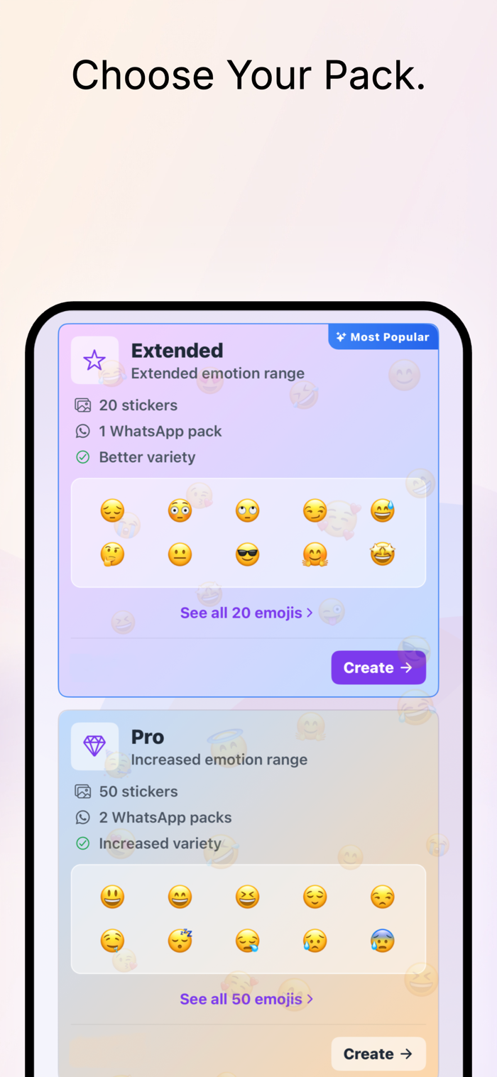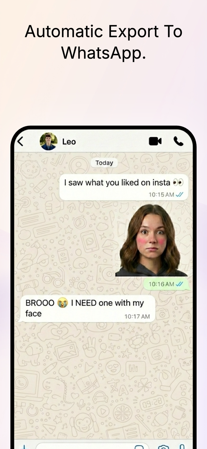 Create personalized emoji stickers from your photos in seconds. Generate cute reactions, funny faces or full sticker packs of your moods. No design skills needed. Auto-export to WhatsApp in one tap. Save and re-use favorites. Ideal for daily chats, group convos, sharing on birthdays/ holidays. Works by uploading a photo/ selfie, generating stickers, picking favorites to build a pack, then exporting to WhatsApp to start sending.