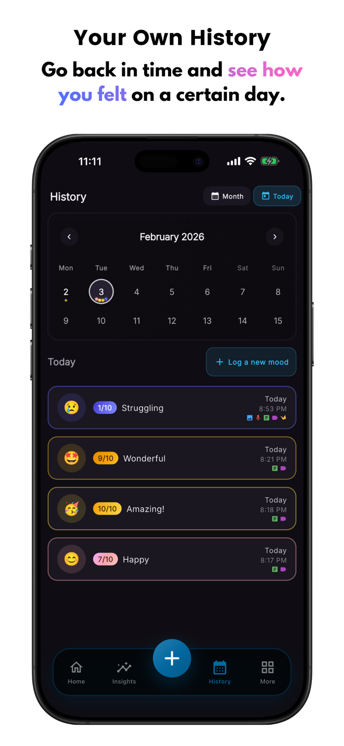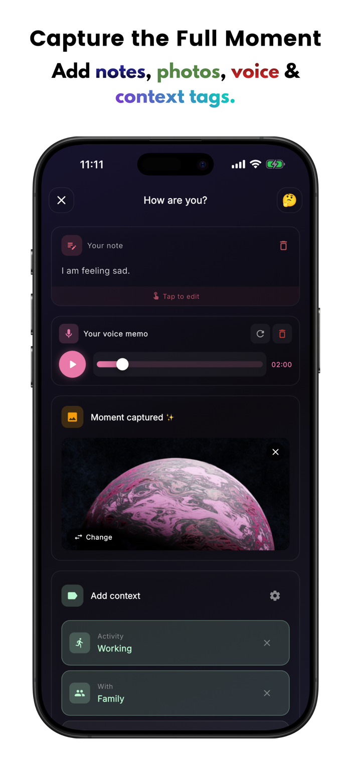 Add notes (up to 1,000 characters), photos, and voice memos (up to 2 minutes) to capture the full context behind each day. Tag activities, companions, and locations to discover what affects your wellbeing.