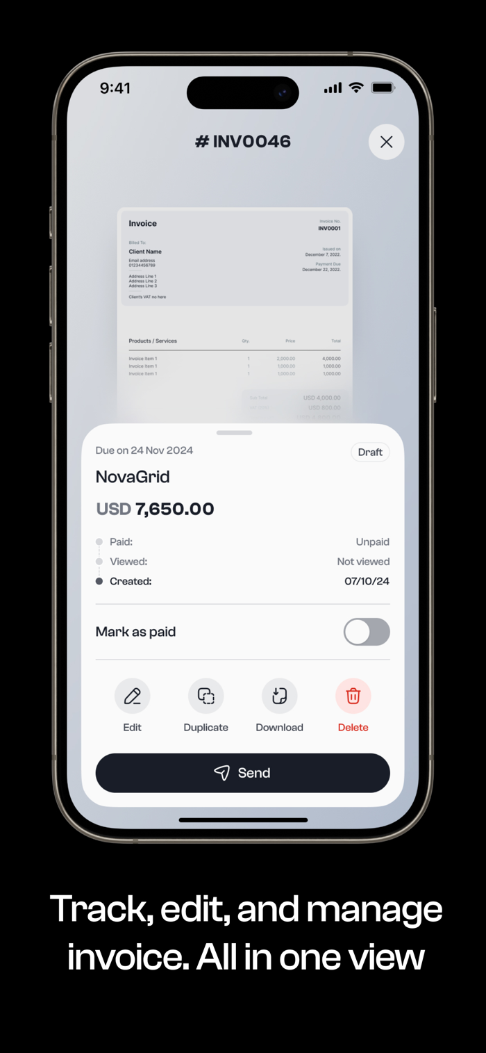 - Send invoices in a professional PDF format for seamless communication and record-keeping.
