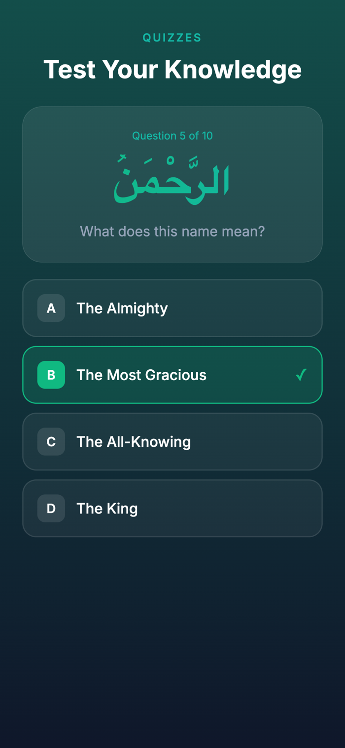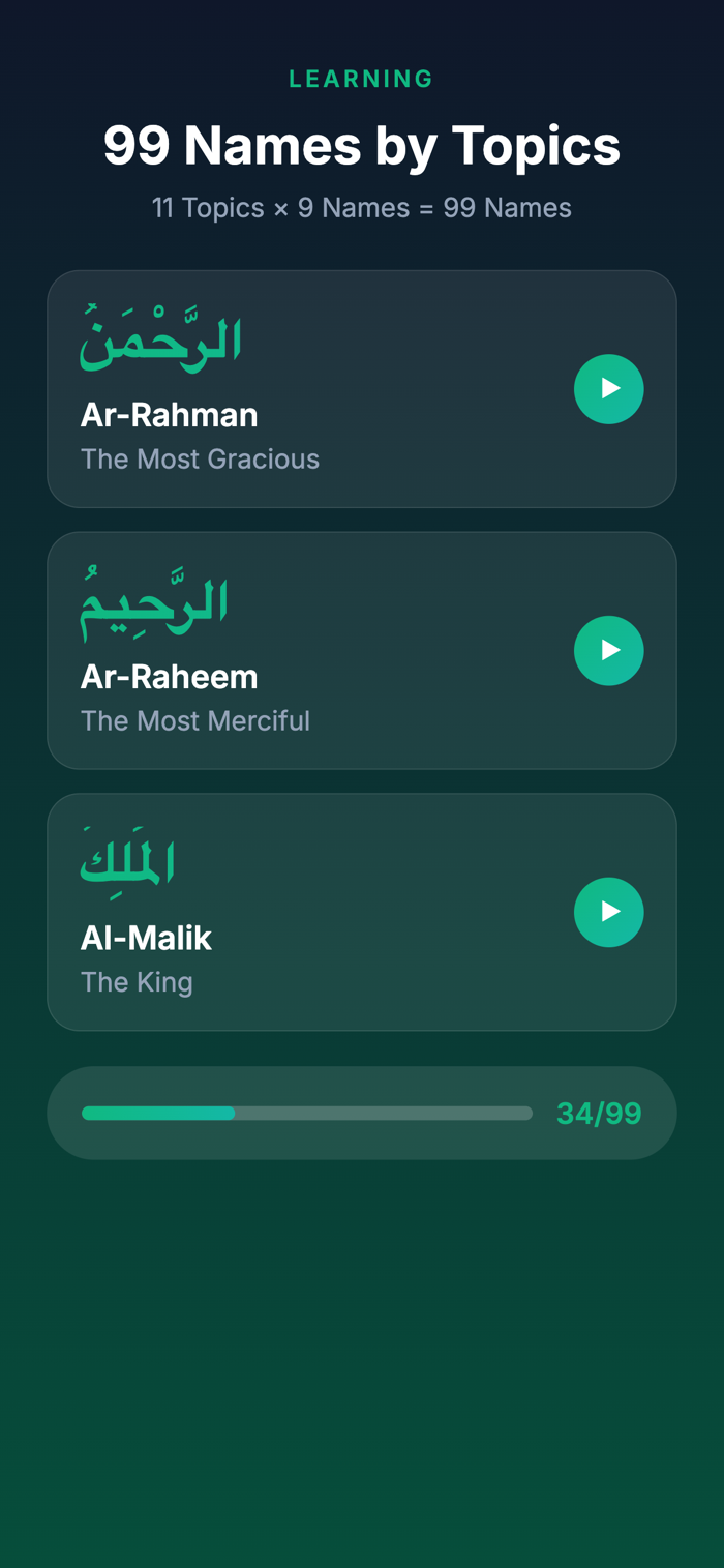 Rawdah是学习和记忆99个真主美名的个人指南。有专业音频助你听母语者发音并完美背诵;互动测验含多种题型,高效检验知识;能跟踪学习进度;通过游戏化机制,如获经验值、保持学习 streak、解锁成就徽章、升级等激励学习;结构组织有序,99个名字分11个主题部分,每个名字含阿拉伯文本、音译、含义及音频发音;还有黑暗与明亮主题可选,支持英语、俄语、哈萨克语等4种语言。