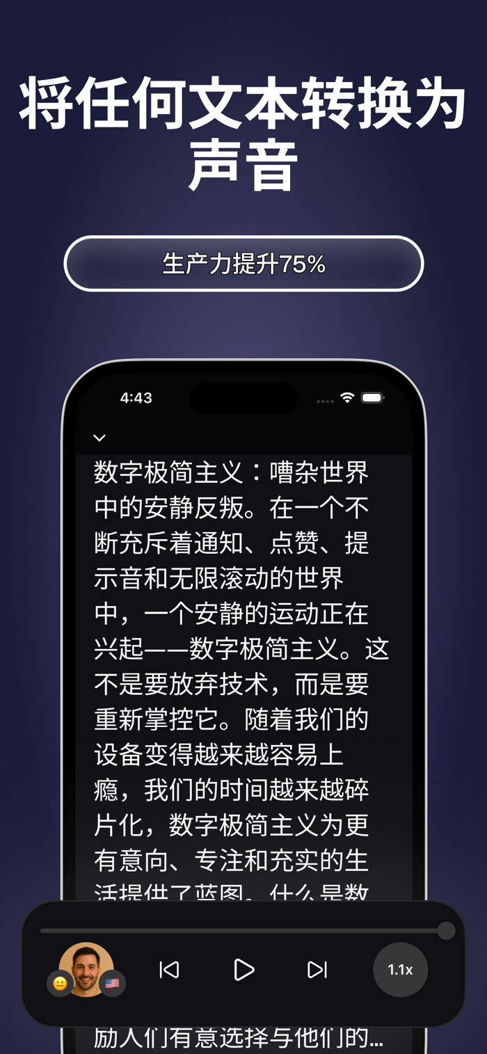 快速收听以提高效率,或慢下来以便清晰理解。