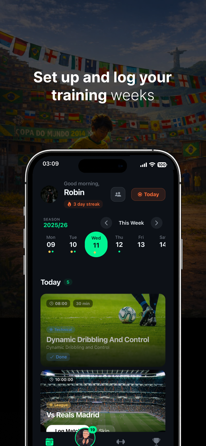 Chat with an intelligent coach that understands your position, skill level, and goals. Get personalized advice, training tips, and motivation whenever you need it. Available 24/7, in your language.