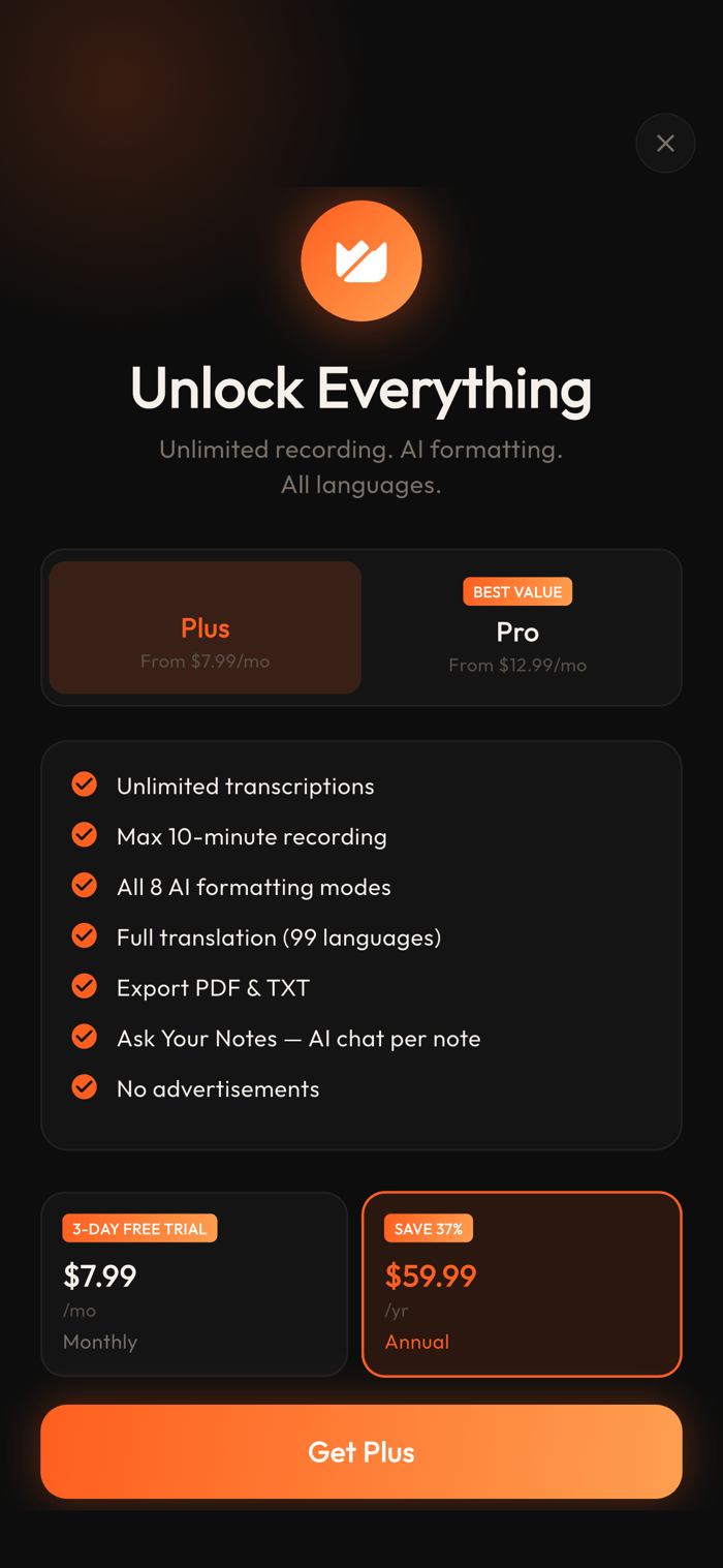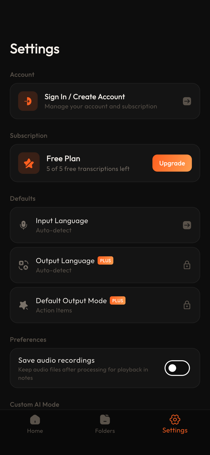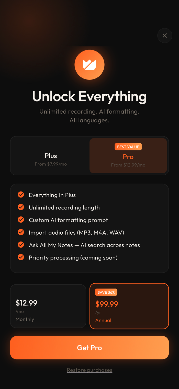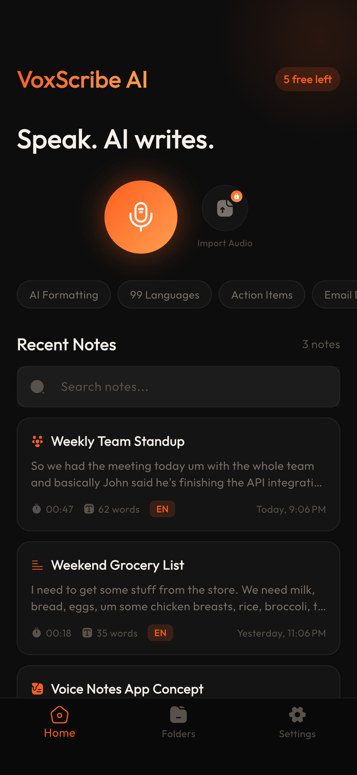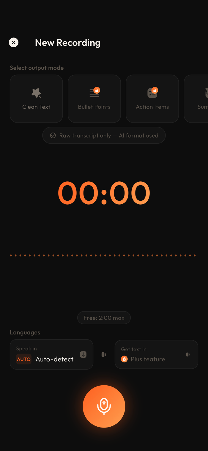 VoxScribe AI可录制或导入音频,利用先进AI将语音转录为99种语言文字,快速准确,支持自动检测语言。能即时将转录内容格式化为会议笔记、总结、邮件、文章等8种形式,免费版每月有5次转录、2分钟录音限制等,付费版无转录限制、10分钟录音限制等,功能强大且使用灵活。