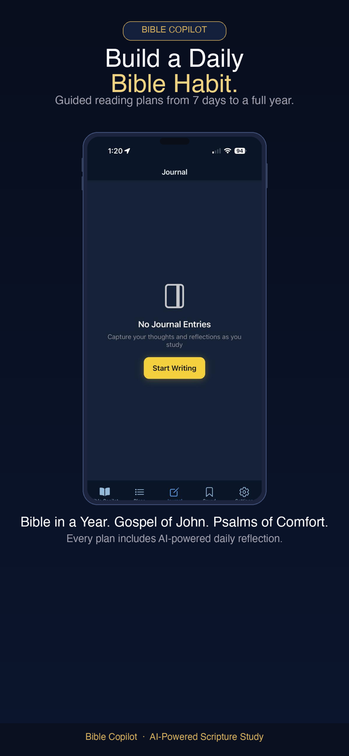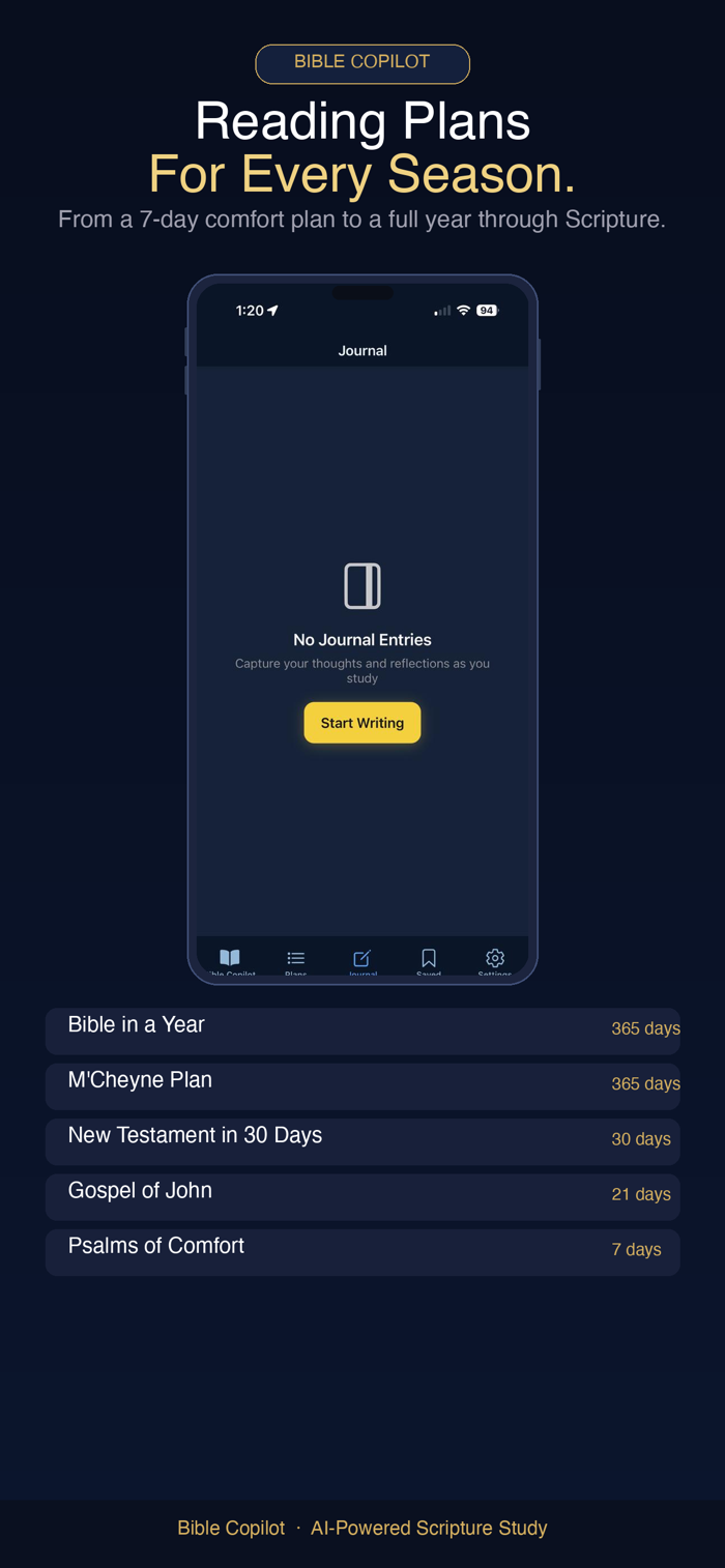 Follow structured plans that build lasting habits. Start with the Gospel of John — completely free, no Pro required. Additional plans cover Romans, Psalms, Genesis, and ...