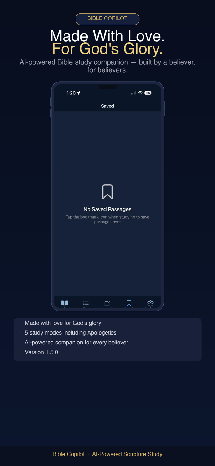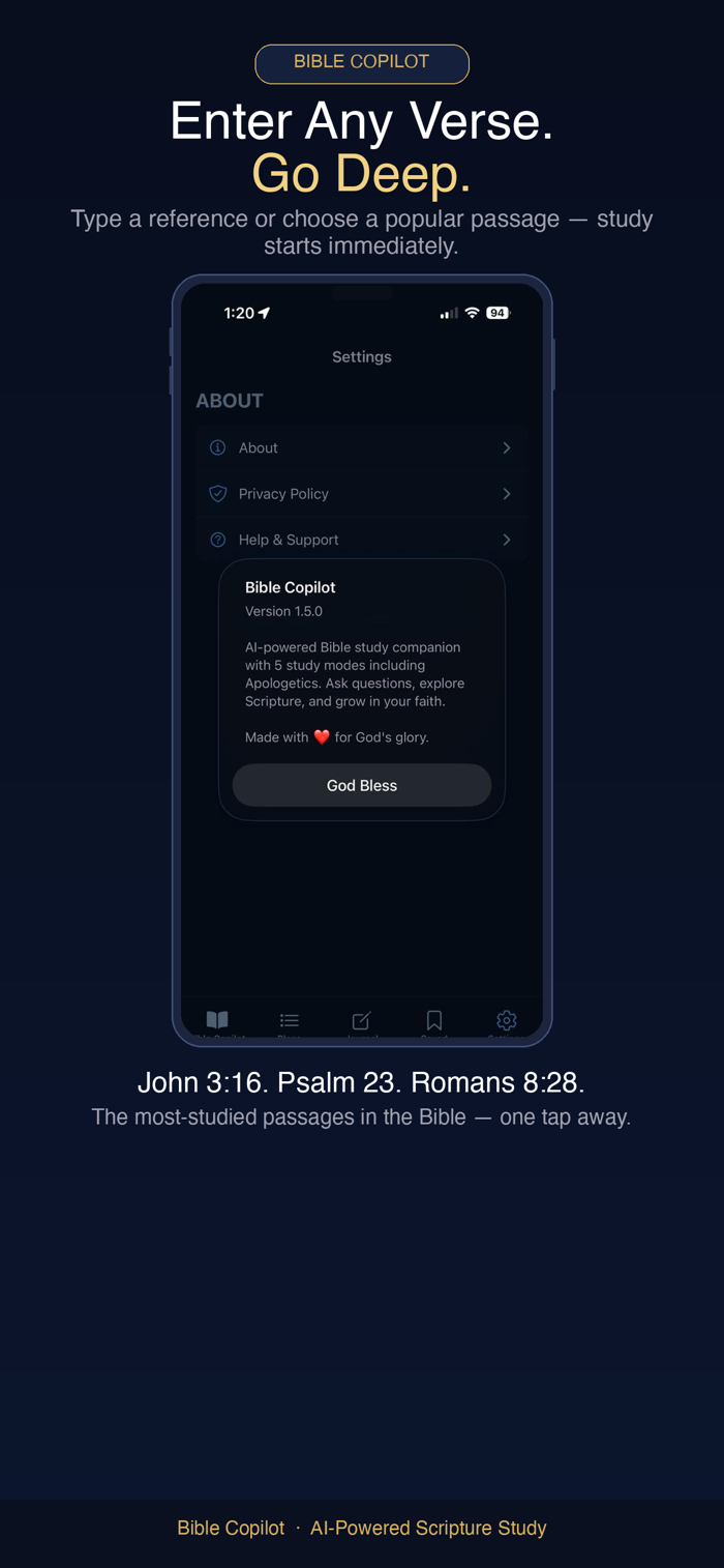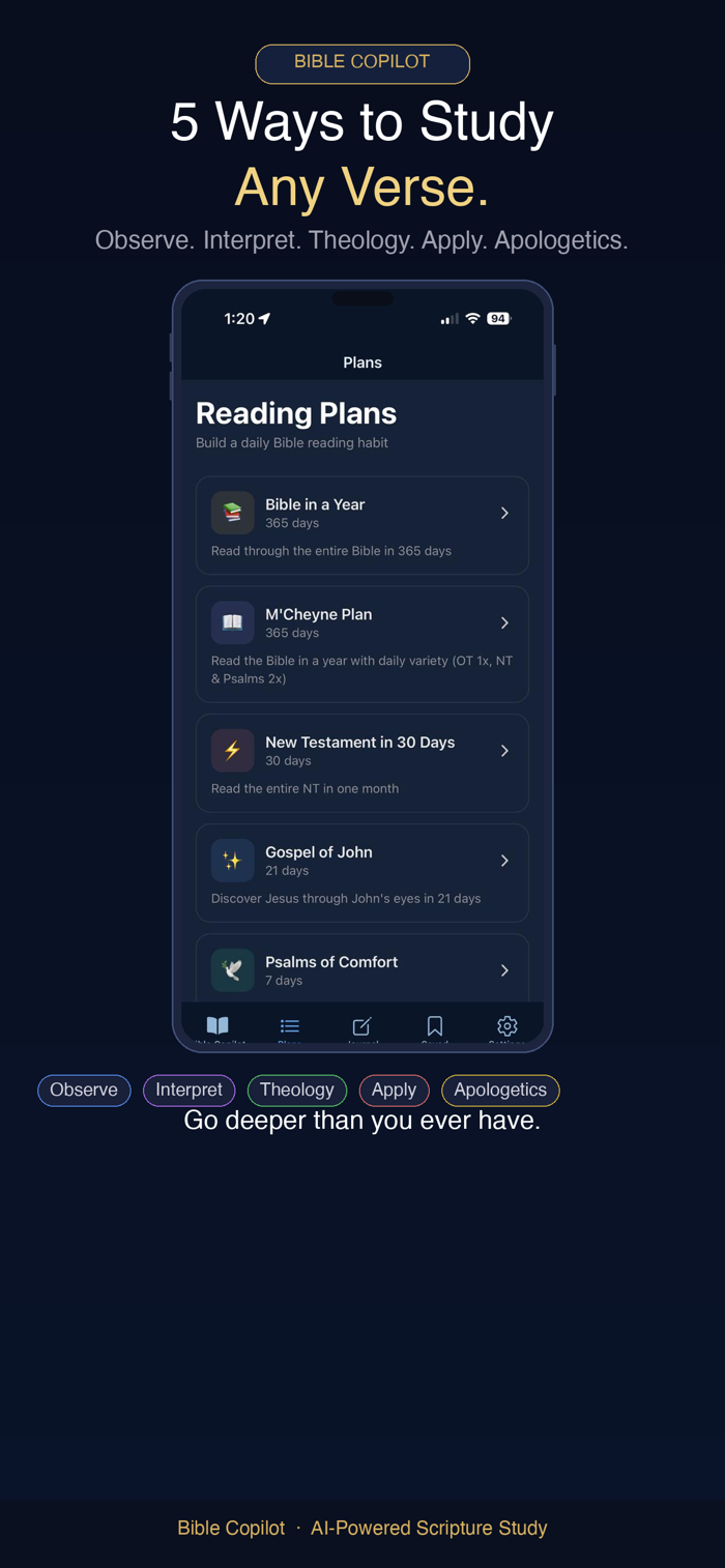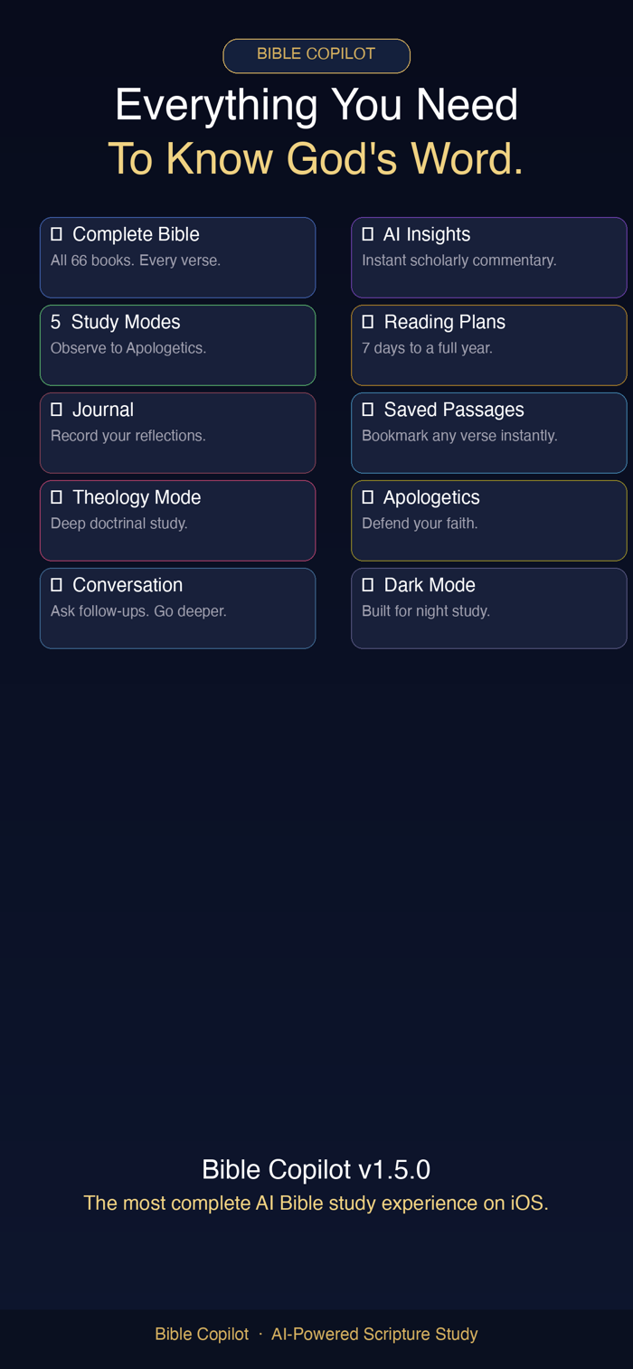 Ask any Bible question and get instant, verse-backed answers. Bible Copilot uses the inductive study method trusted by pastors and scholars — Observation, Interpretation, Theology, Application, and Apologetics — all in one tap.
