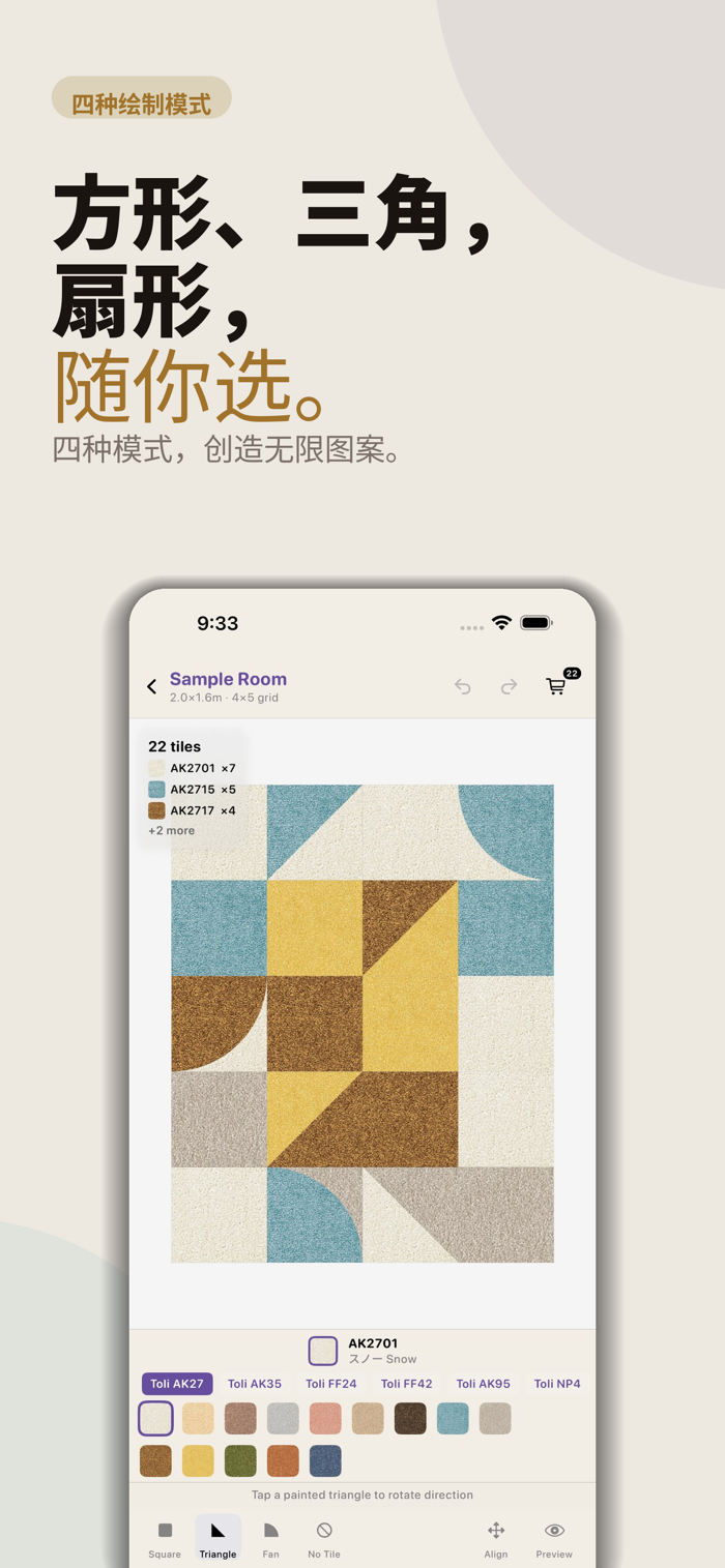 TileGrid可在购买方块地毯前帮你设计房间拼花方案。选真实TOLI色卡,输入房间尺寸,从6大系列70多种颜色中选色涂色,有4种涂色模式,能标记不铺区域,自动计算边缘裁切,告诉你每种颜色用量,一键分享材料清单。功能亮点包括70+种色卡、多种涂色模式、自动计算、拖动调整、全屏预览、用量汇总、不限房间数量、50步撤销/重做,离线可用无需注册,数据本地保存。