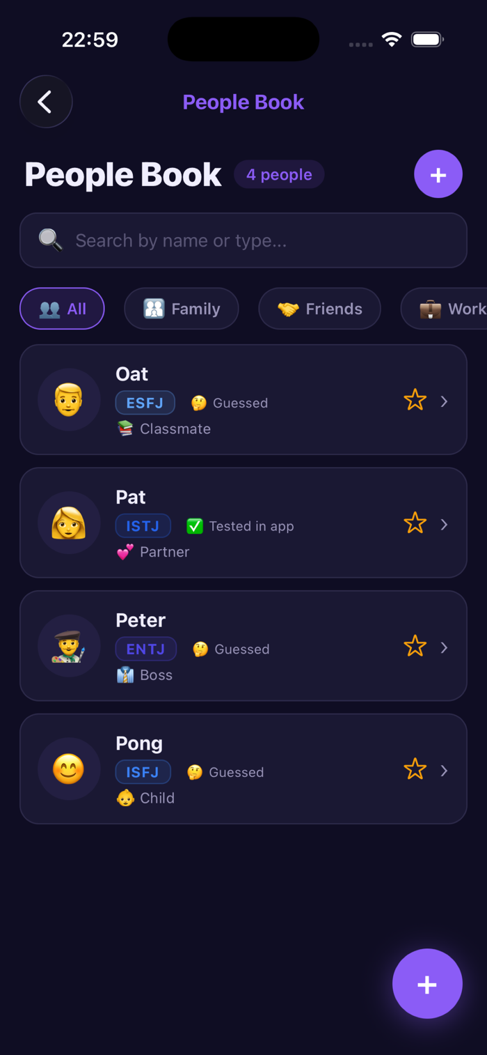 VerType是功能全面的MBTI性格测试与分析应用。有28题测试,配备误判检测确保结果准确。涵盖16种人格类型详解、精准配对分析、职业匹配评估、团队动态分析等功能。还有独家人际关系档案、沟通指南、7天成长挑战。支持10种语言,有精美暗色主题,支持图片分享。一次付费永久解锁,无月费订阅、广告及额外付费,仅供娱乐和自我探索,不能替代专业诊断或咨询。
