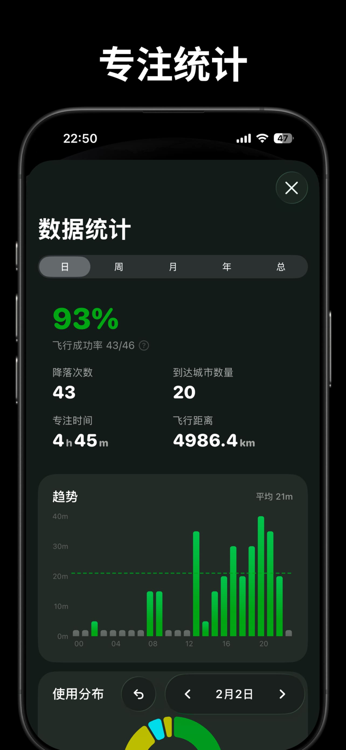 追踪你的专注轨迹:降落次数、专注时长、飞行距离、到达城市数
