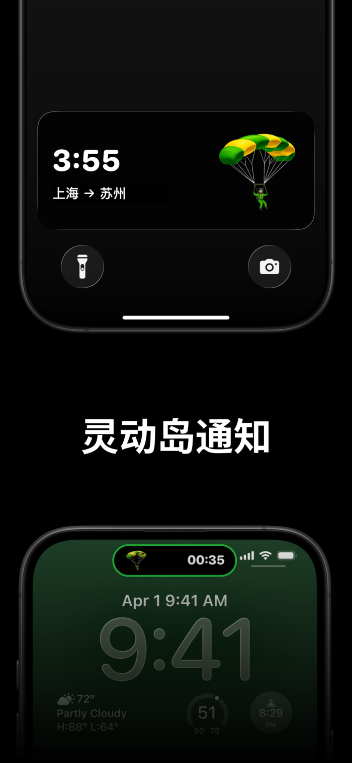 专注时在灵动岛与锁屏实时显示倒计时与城市路线,随时掌握飞行进度。