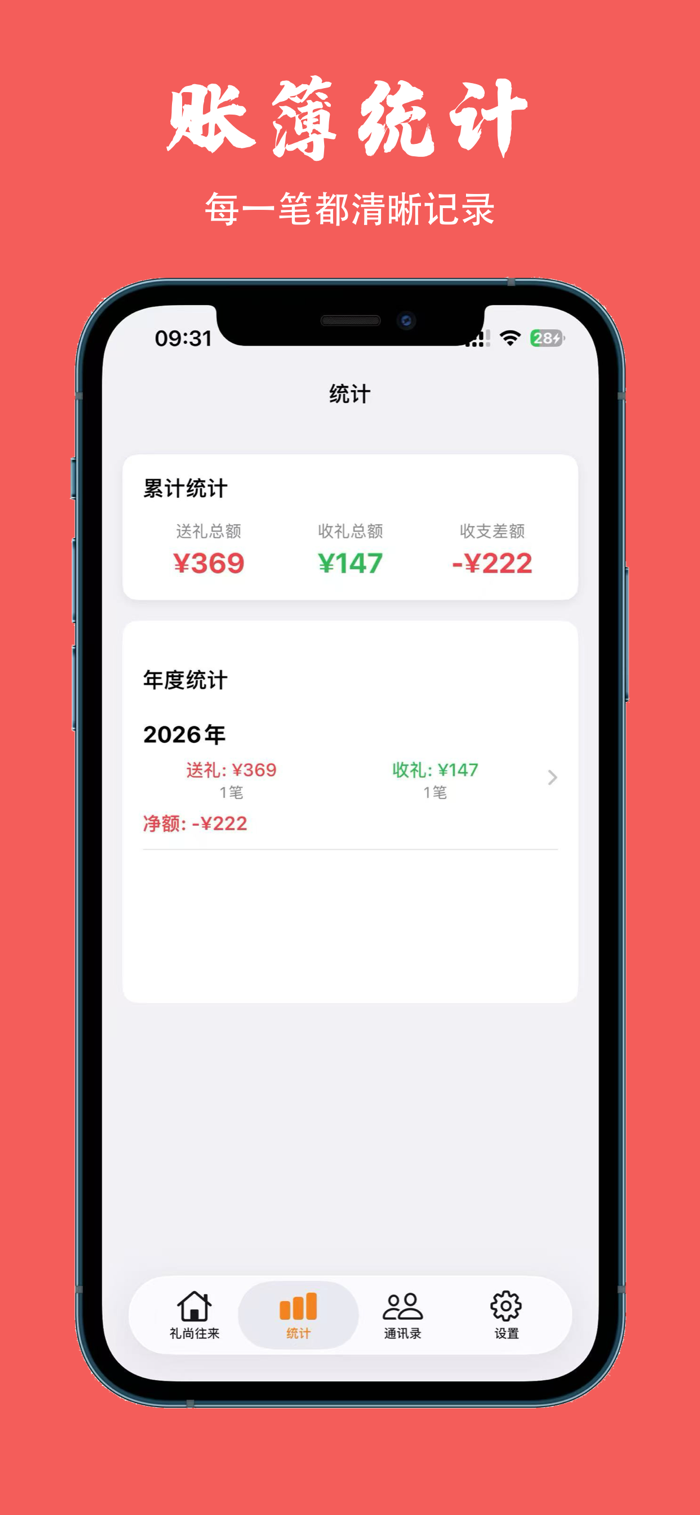 - 往来总览清晰:直观查看年度往来差额、待回礼提醒,不用费心记,每一份心意都不遗漏。