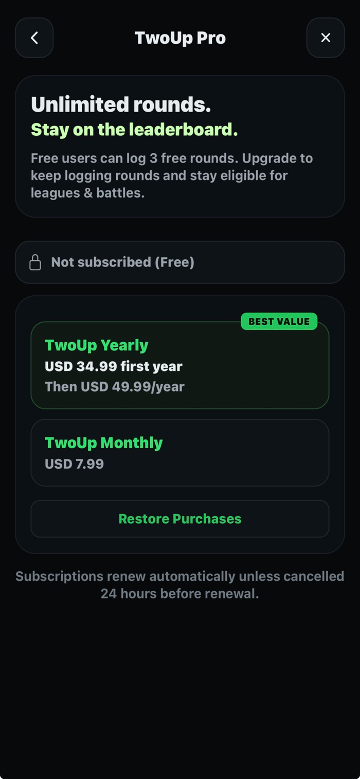 Whether you're playing casually, running a weekly group, or organising a golf trip, TwoUp keeps every round competitive.