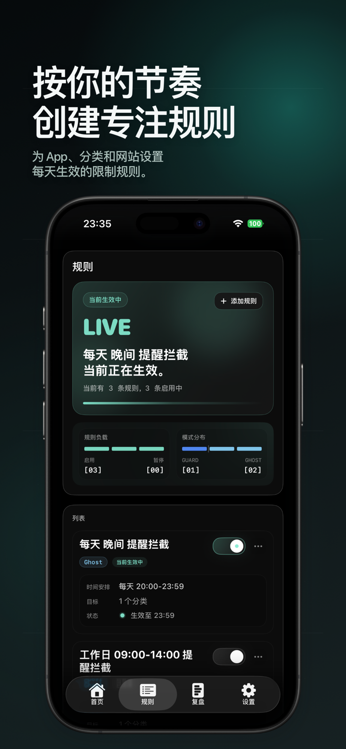 你可以基于 Apple 的屏幕使用时间能力,为指定应用、分类和网站设置定时规则,并在提醒模式与强拦截模式之间自由选择: