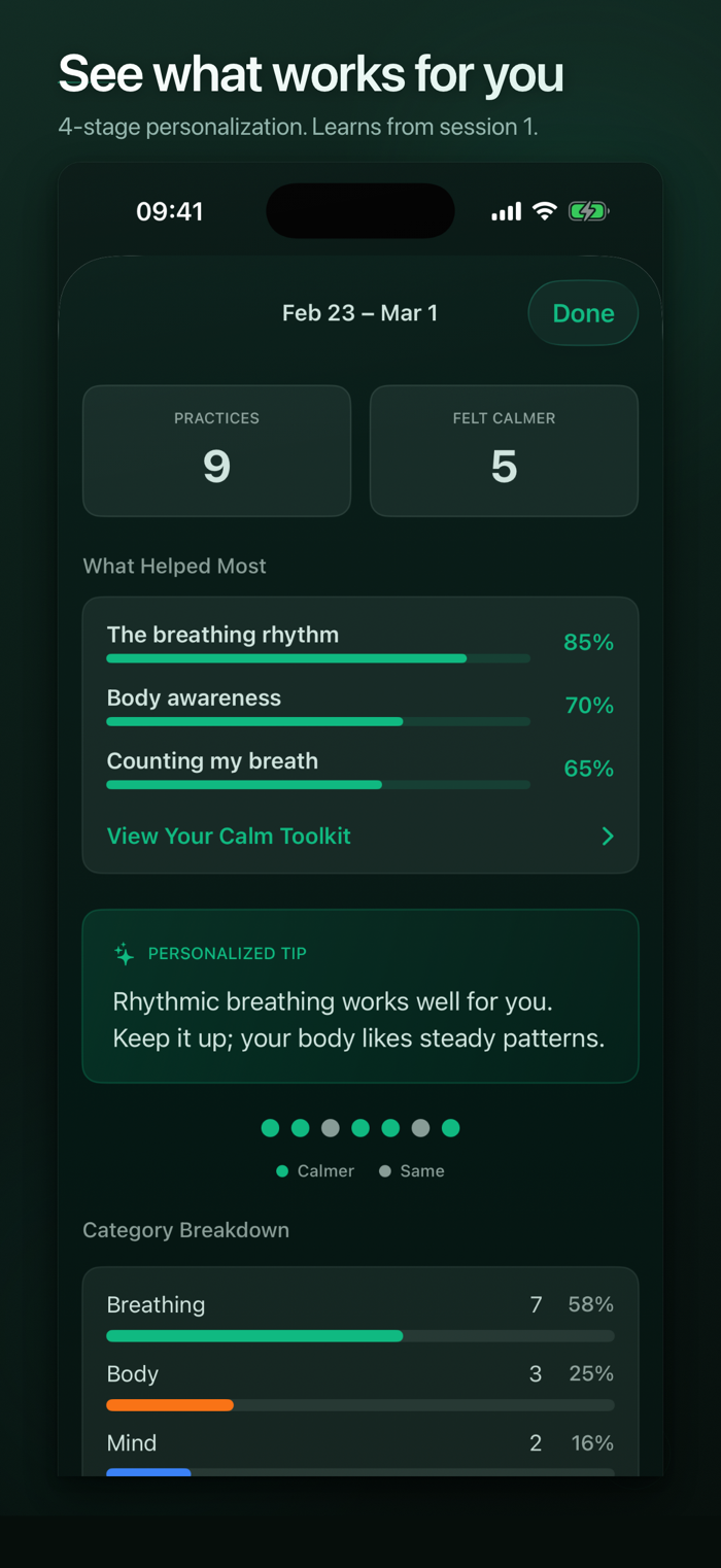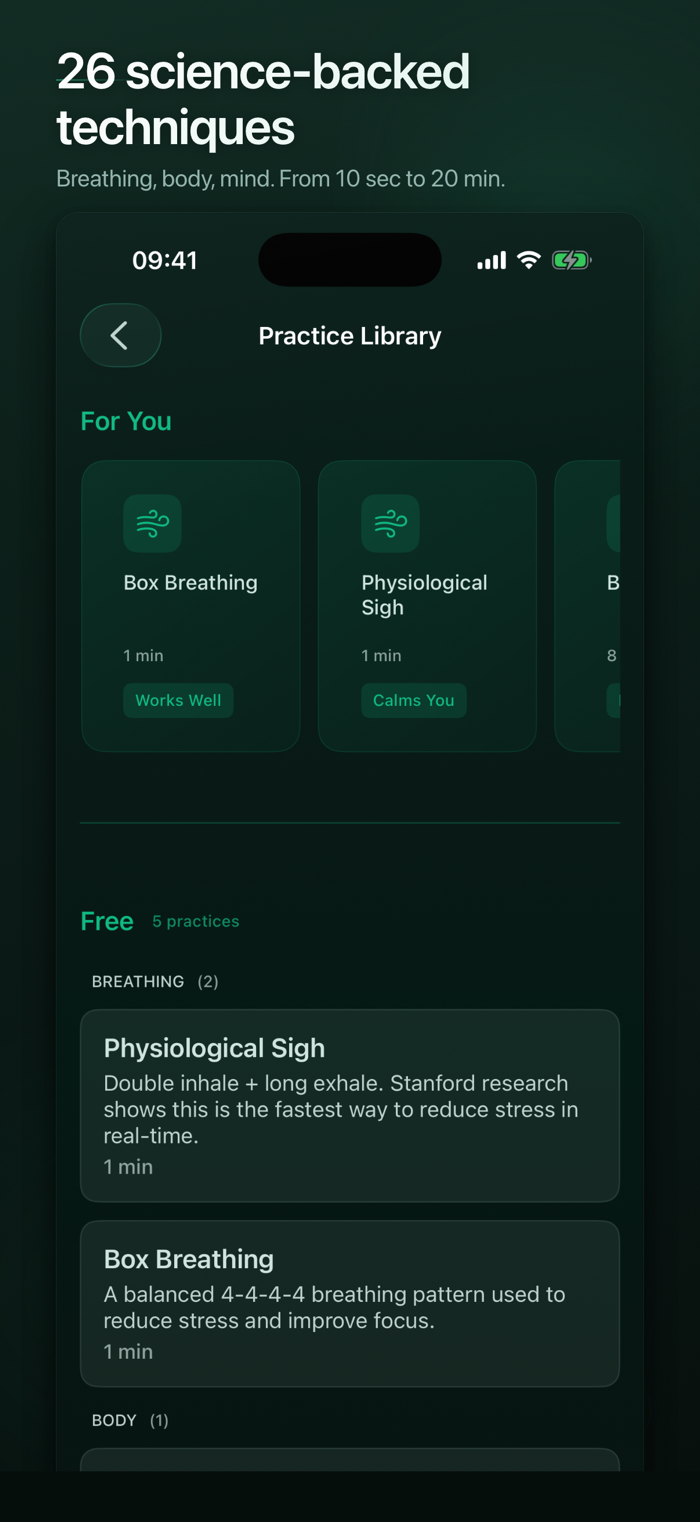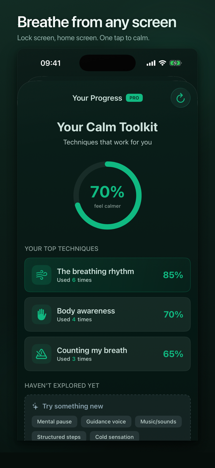 Respiro能在10秒内助您平静下来。它通过7种行为信号了解您的压力模式,无需智能手表,适时推荐合适呼吸技巧,有21种经科学验证的方法。具备智能压力检测,追踪7种行为信号,无需智能手表、HealthKit及云端,数据全在手机。4阶段个性化引擎,从第1次会话开始学习,第15次会话完全校准,还会说明推荐每项练习的原因,专为需要实用工具而非冥想库的人打造。