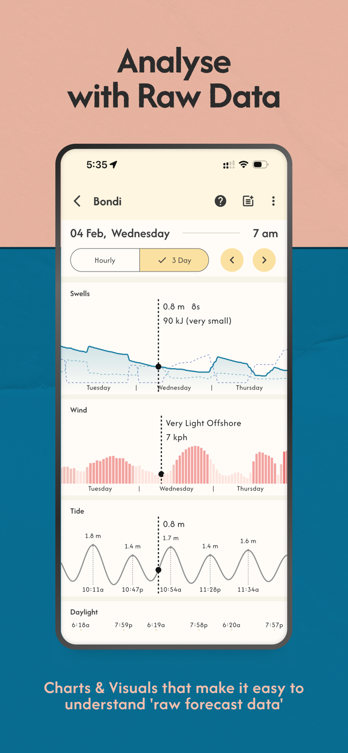 - Raw forecast data from the premier weather agencies. Primary, Secondary, and Wind Swells. Height, period, & direction. Wind strength & direction. Tides. Sunrise & Sunset times. Water Temp. Weather including rain & cloud cover.