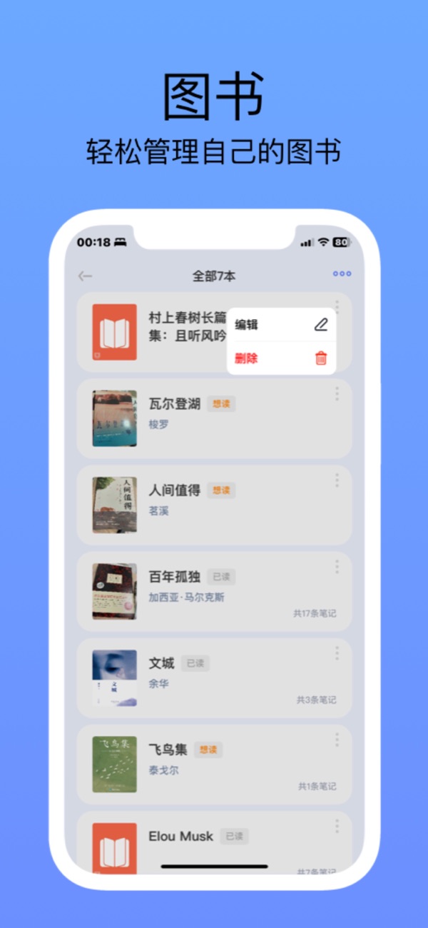按照多种状态给自己的图书进行分类,从而轻松管理自己的书籍。也可以导入电子书籍,散记并支持电子书籍的阅读。实现阅读自由。