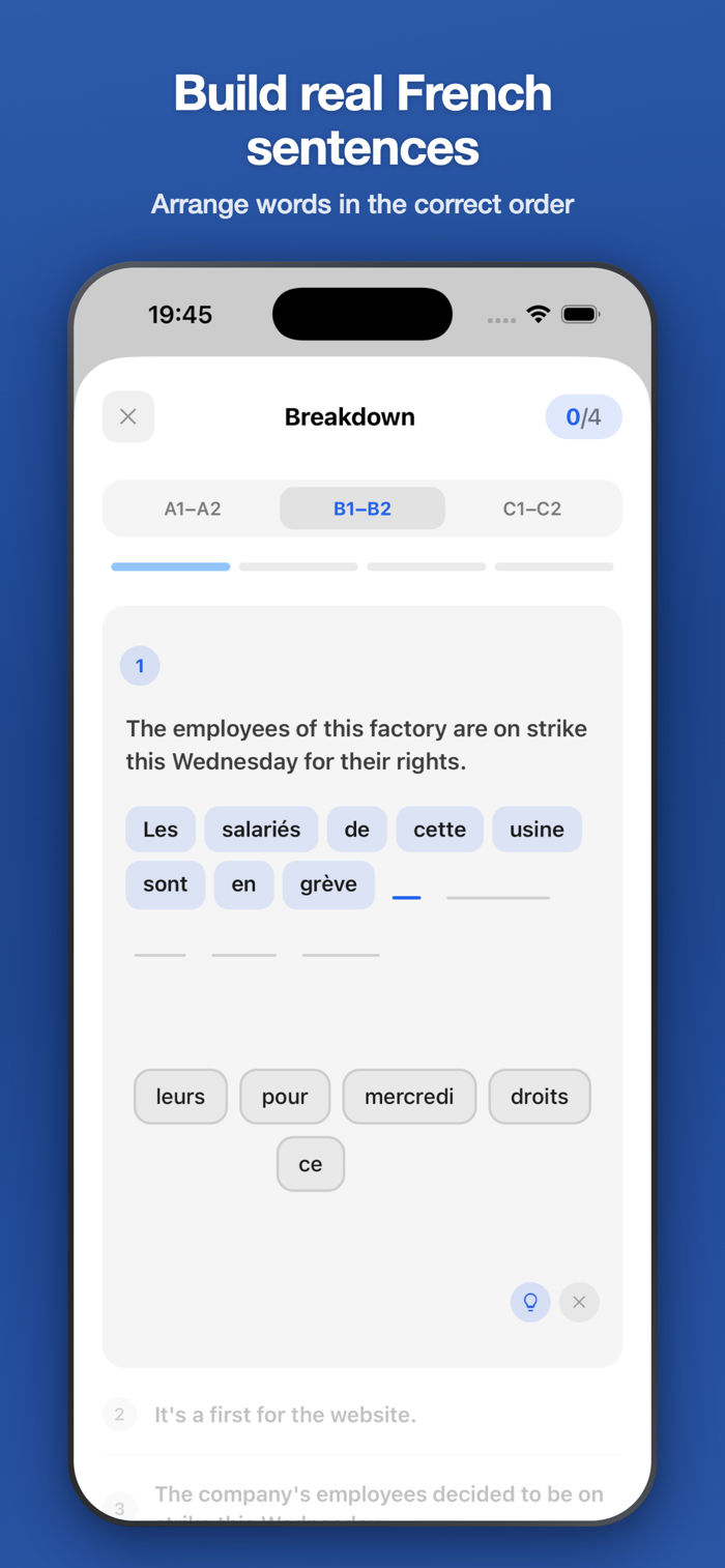 Build real French sentences word by word. Three difficulty tiers to challenge yourself.