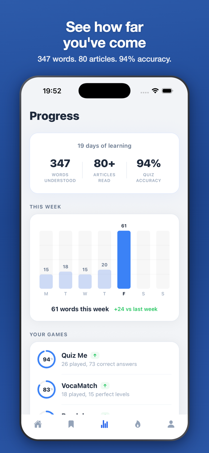 Read an article, play a game, tap a word. Any activity counts. Track your progress on a calendar and stay consistent.