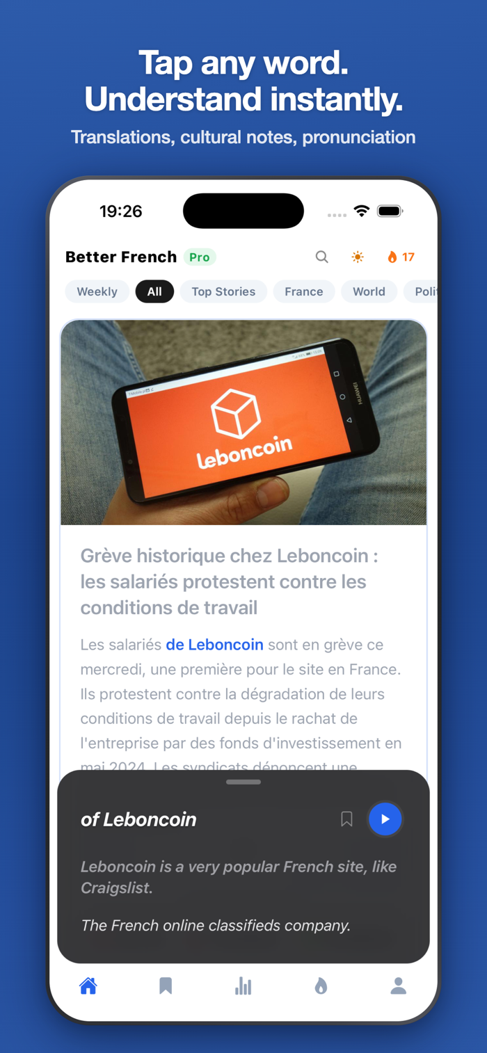 Tap any French word for an instant translation with cultural notes and example sentences. Available in English, French, German, and Spanish.