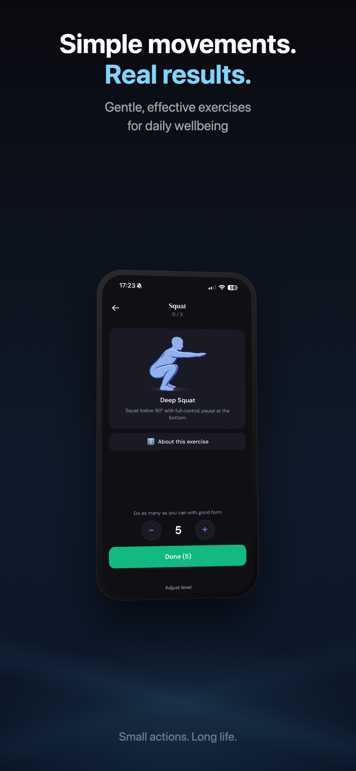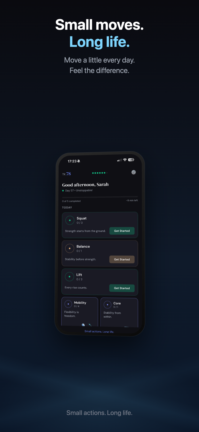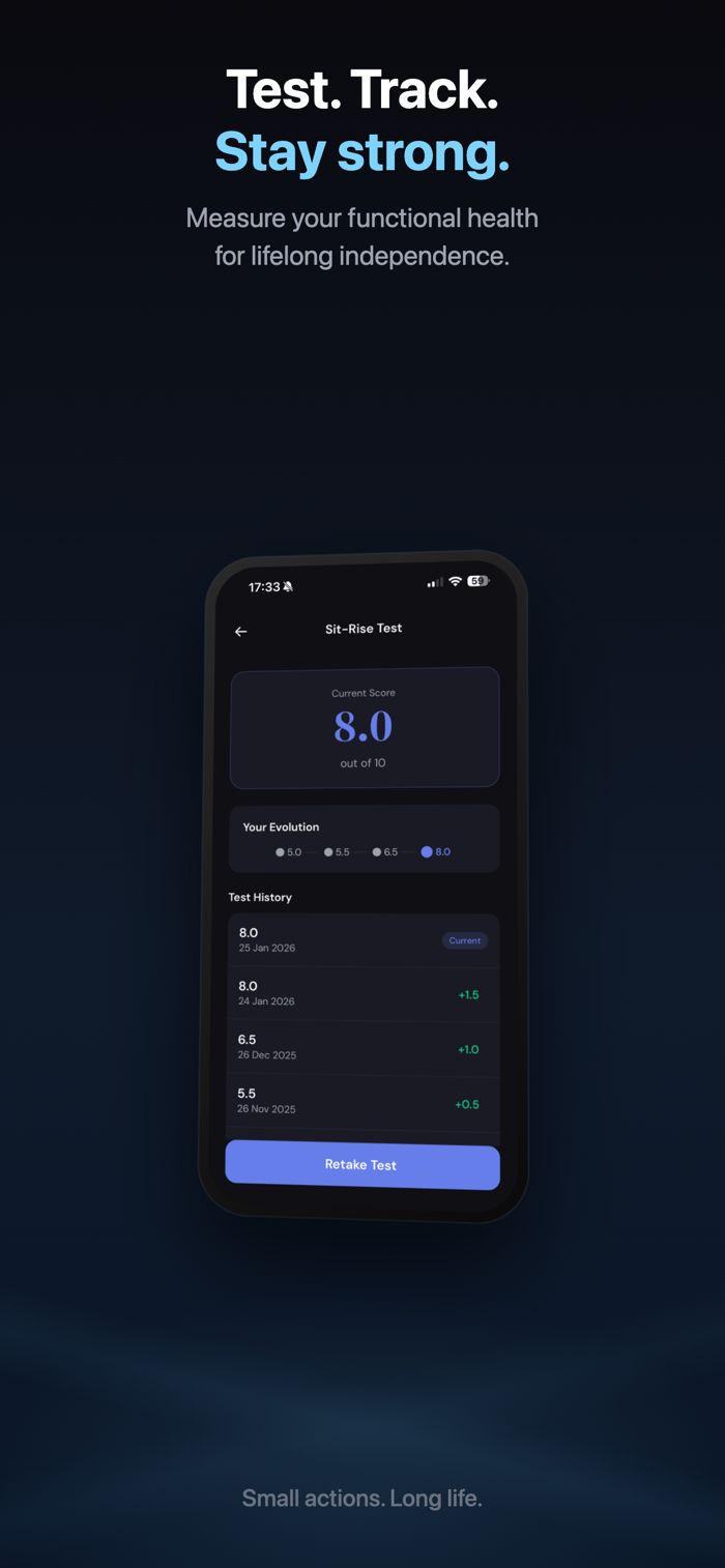 Tikep是身体维护系统,非健身应用。每天只需9分钟,无需健身房和器材。它通过让用户进行坐立测试评估功能健康,接收个性化每日运动处方,完成简短“运动零食”训练并通过TK指数跟踪进度,专注深蹲、推、拉、平衡、移动性、核心、提升7项功能能力,每项运动有清晰指导及对长期健康重要性说明,助用户轻松从地板起身,保持良好移动,养成保护未来自己的习惯。