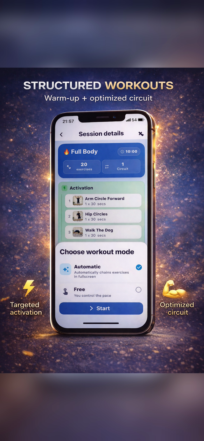 Vyron助力运动员更智能训练,通过短而有效的锻炼增强力量与训练连贯性。无论何种运动或想保持健康,它都能提供契合日常生活的结构化训练。训练时长5至20分钟,有清晰动作指导、内置计时器和结构化训练组,还能追踪进度、监测训练情况与肌肉平衡。其设有等级系统,激励用户训练。该产品所需设备少、训练简单,能带来最大效果,助你为运动变得更强。