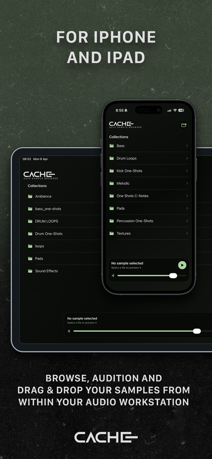 CACHE is a fast and simple sample browser for iPhone, iPad, and AUv3 hosts. It lets you open your own sample folders, browse collections instantly, preview audio files, detect sample key, and drag sounds straight into compatible apps and hosts.