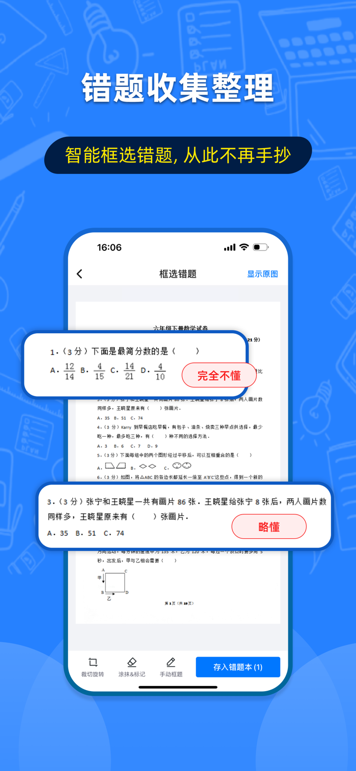 错题整理:自动框选错题,一键去除手写,自由选择错题组卷打印,错题针对性练习