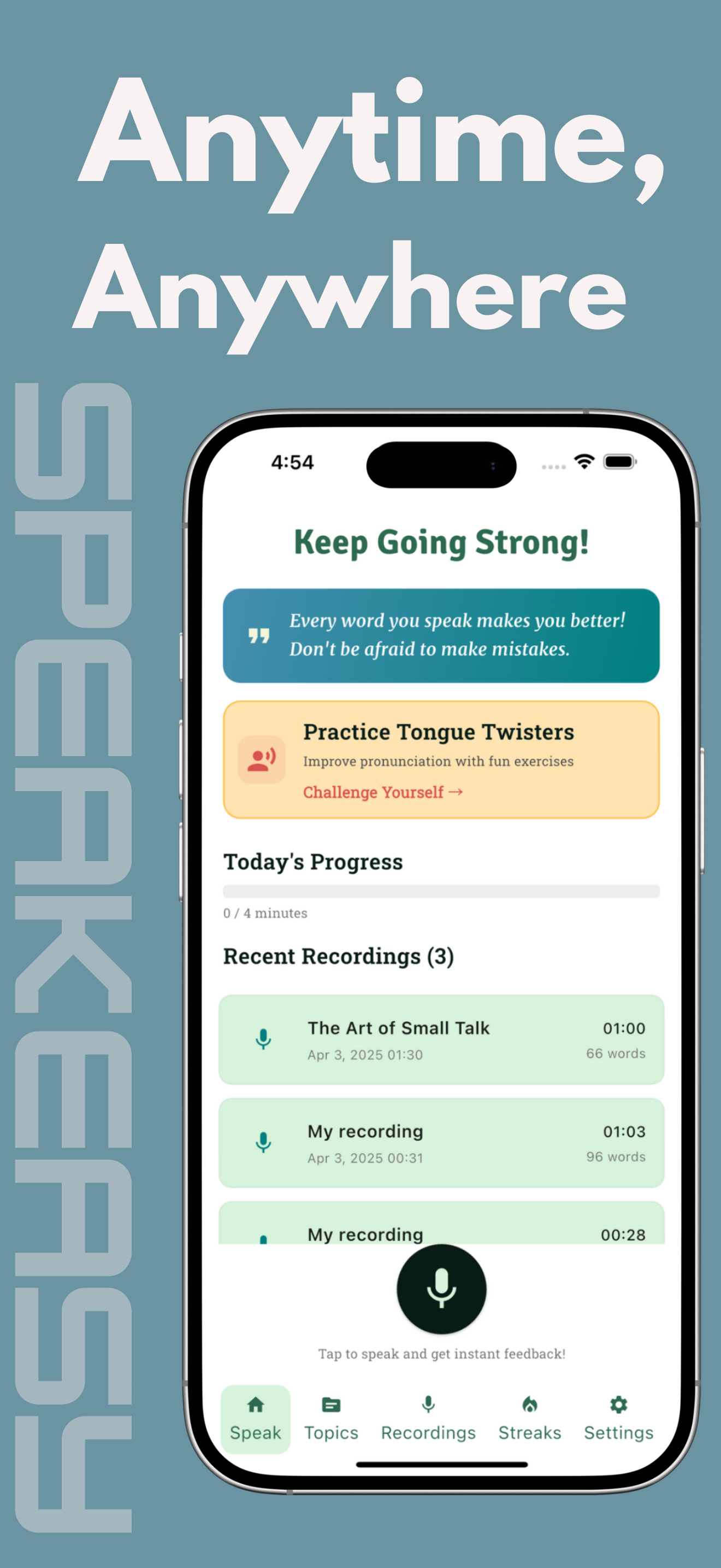 SpeakEasy借助自然AI对话提升英语口语能力,让练习有趣、有效且无焦虑。提供纯语音练习,可录音与AI聊天,发送前能查看转录内容,不满意可重录。AI能根据语境回应,话题多样,有追问保持对话流畅。还能追踪进度,如WPM、检测减少填充词、分析说话时长、查看对话历史。通过每日连胜追踪、成就徽章、每周总结、设定个人目标等方式保持动力。