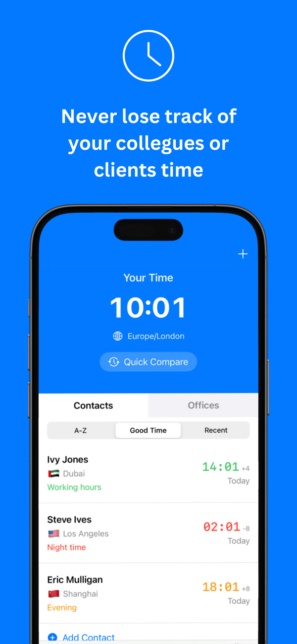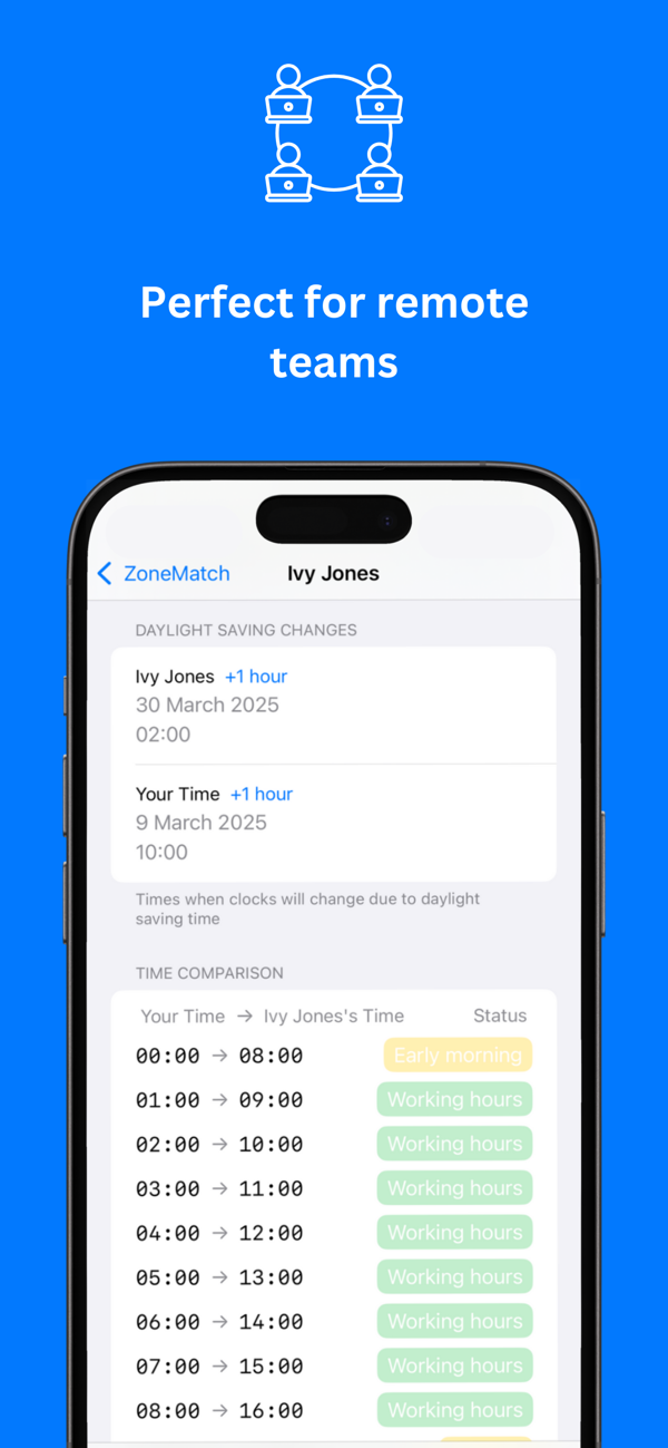 TimeZone Hopper是跨时区协调的必备工具,适用于远程团队、国际商务等。核心功能包括:智能时区管理,能即时查看所有联系人时间,自动检测时区,有可视化时间状态指示,支持全球时区;联系人管理,可添加、管理联系人及其时区,快速查看含当地时间的卡片,方便编辑更新,能按名称或时区组织;最优会议查找,能跨时区找完美会议时间,有可视化调度网格展示最佳时段,避免非工作时间安排,考虑所有参与者工作时间;界面直观,设计简洁现代,支持暗模式。