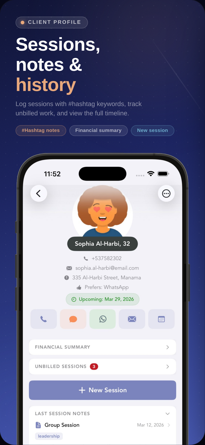 The Smart Coach is the all-in-one practice management app built for coaches, therapists, counselors, and independent practitioners. Run your entire practice from your iPhone, iPad, or Mac — no account required, no data collection, and everything syncs securely through your private iCloud.